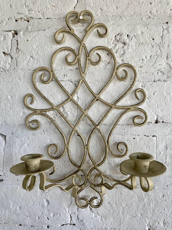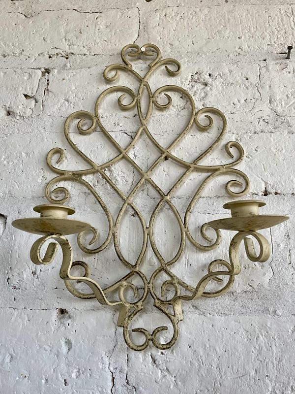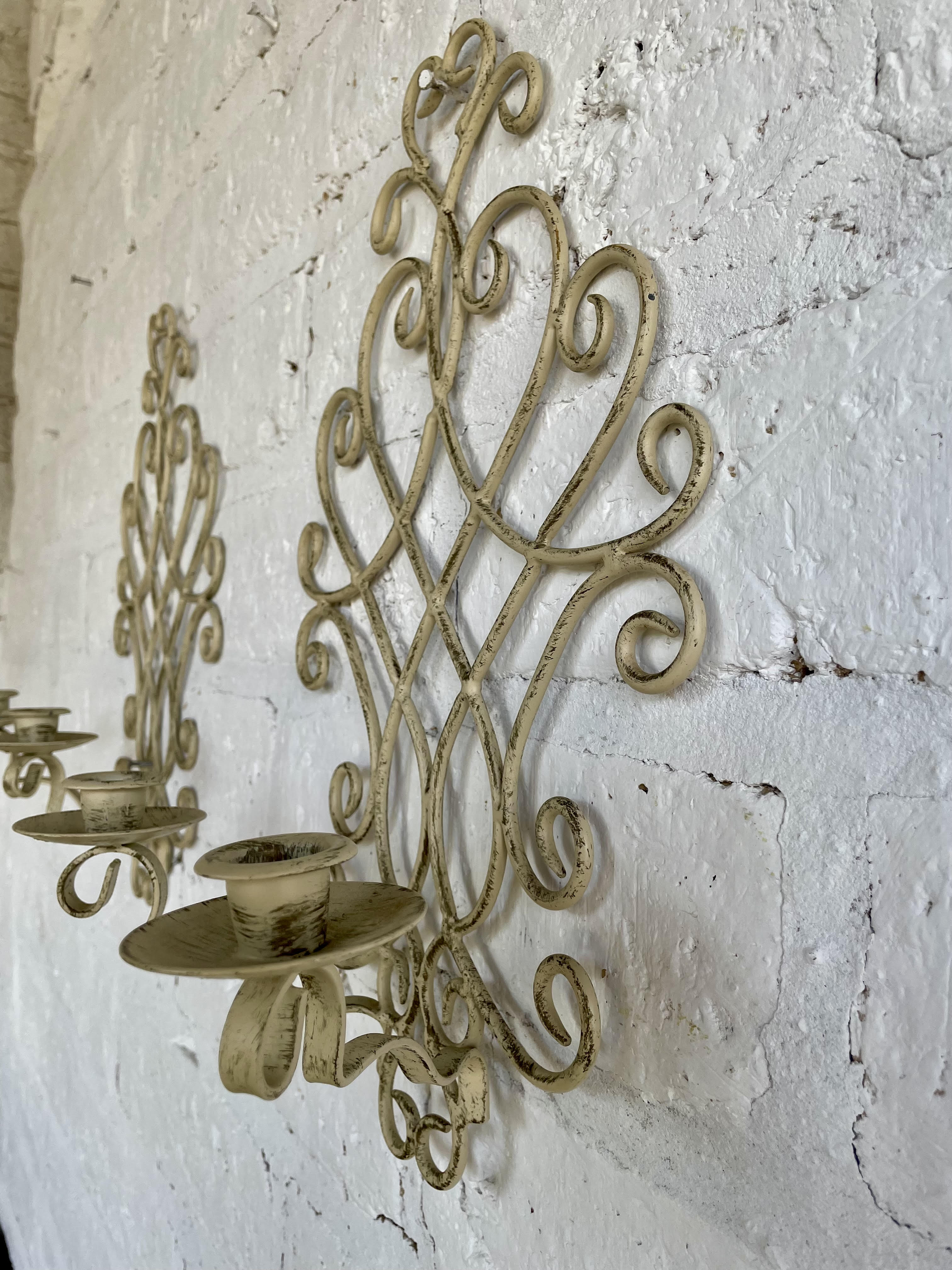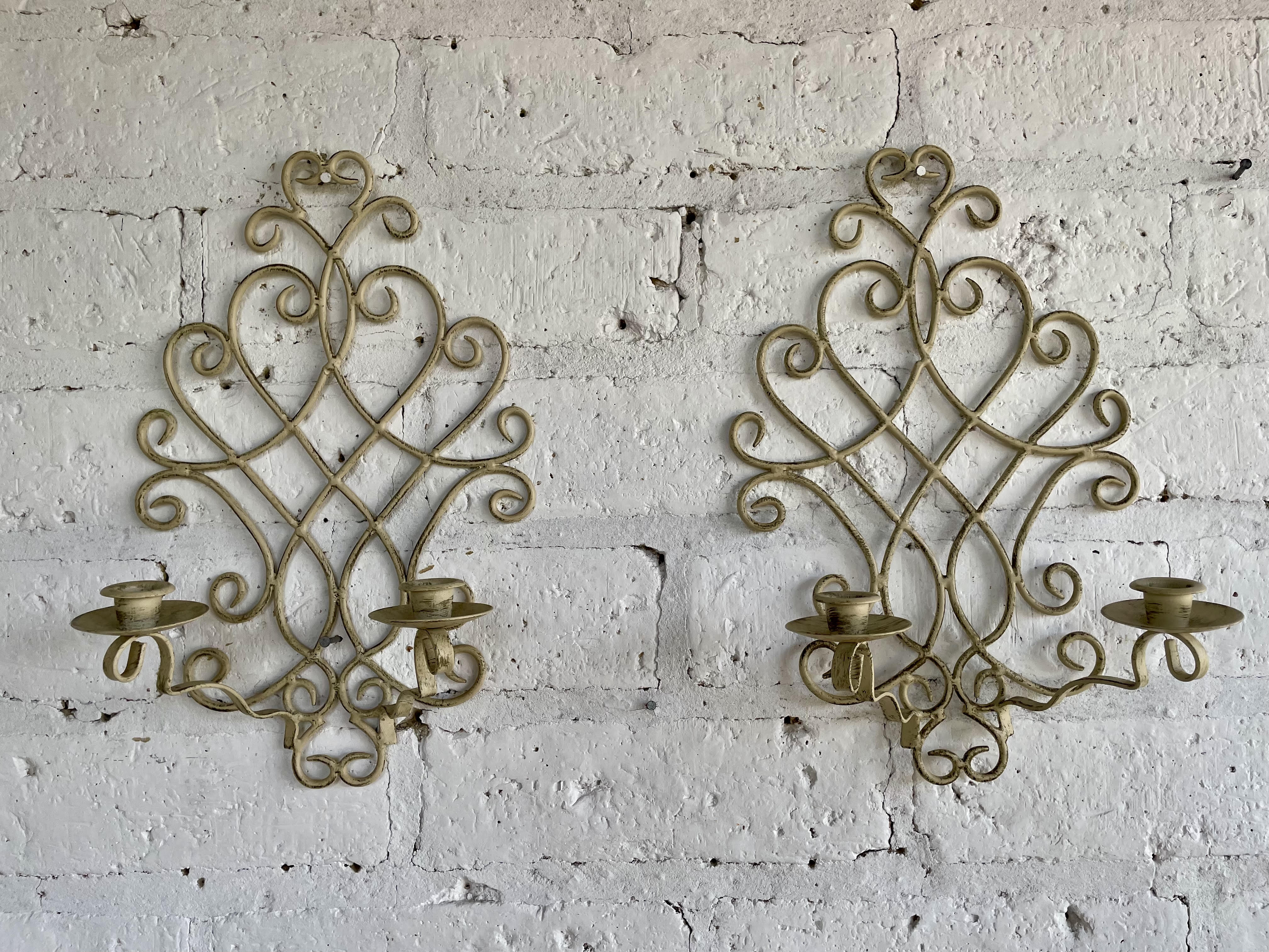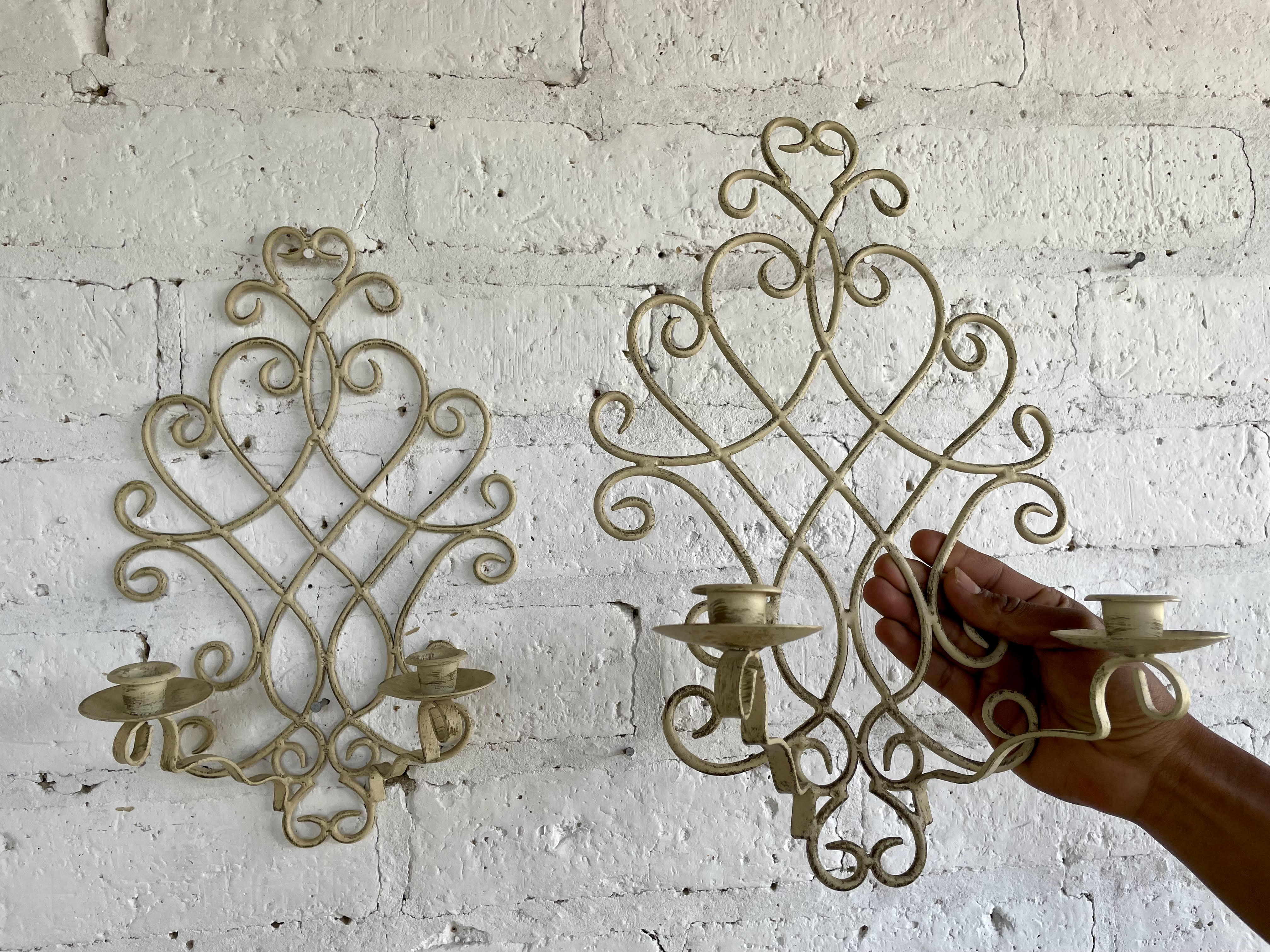 Pareja de candelabros en forja artesanal decorados con pintura desgastada. Cada candelabro tiene dos soportes para velas.