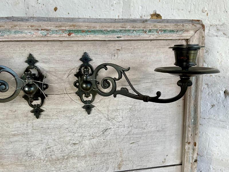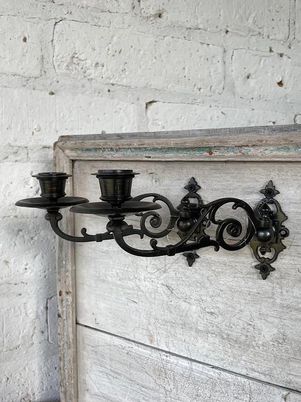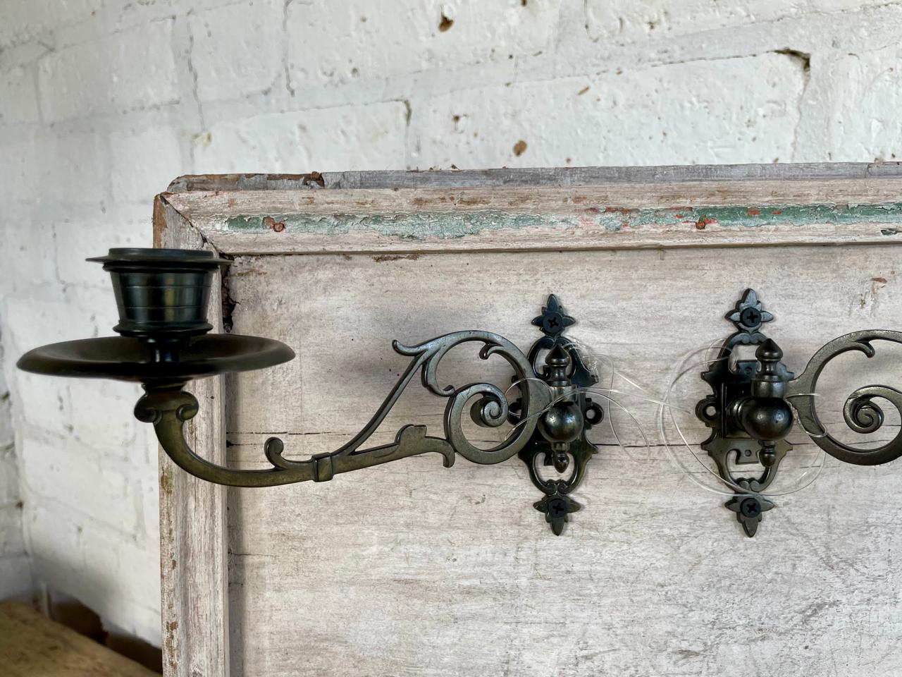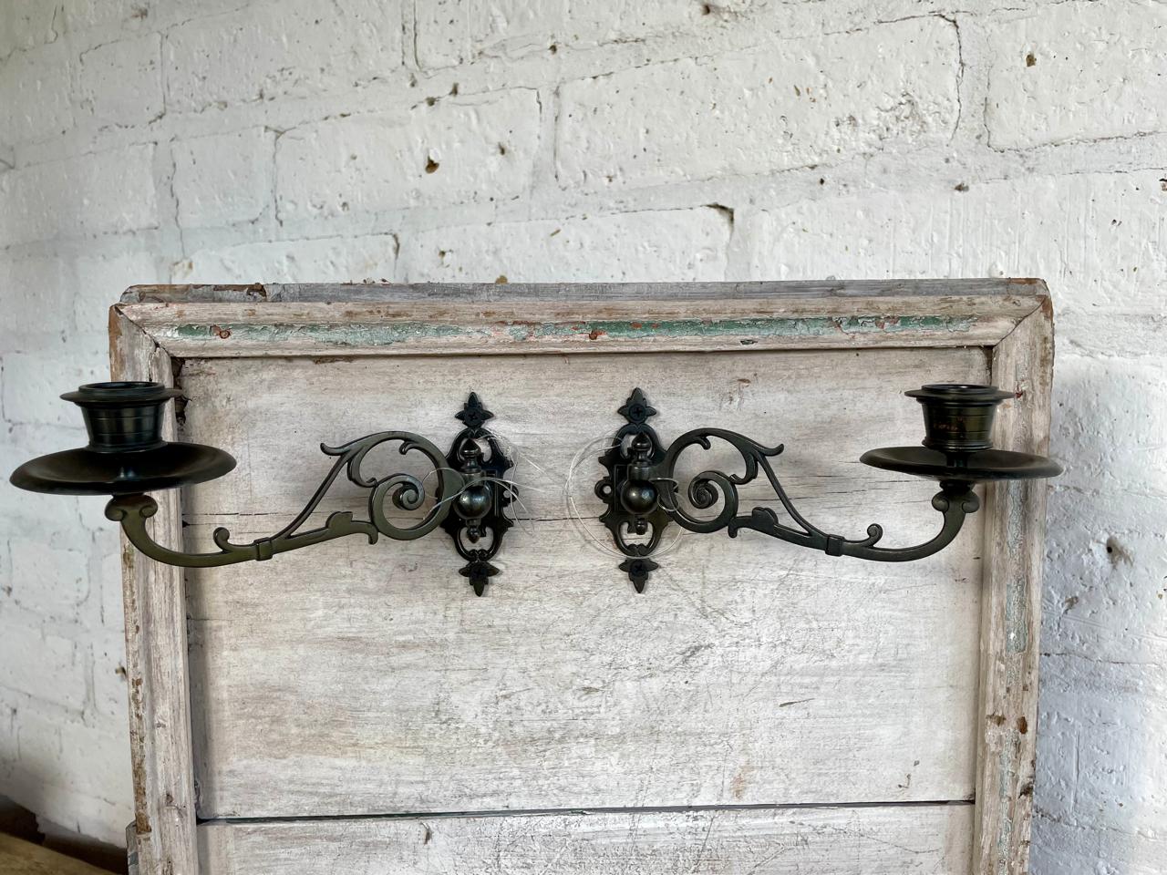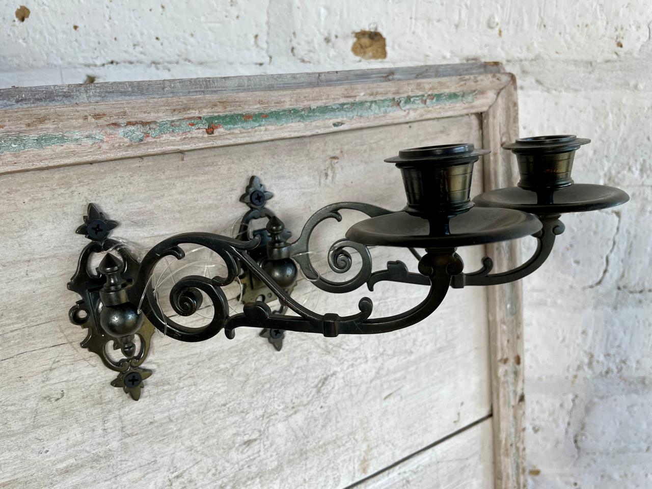 Esta pareja de candelabros metálicos pertenecieron a un piano de la marca Steinway and Sons fabricado en U.S.A. a principio del S XX. Los candelabros se pueden girar hacia los lados y la base permite desmontarlos fácilmente. Se encuentran en bien conservados.
