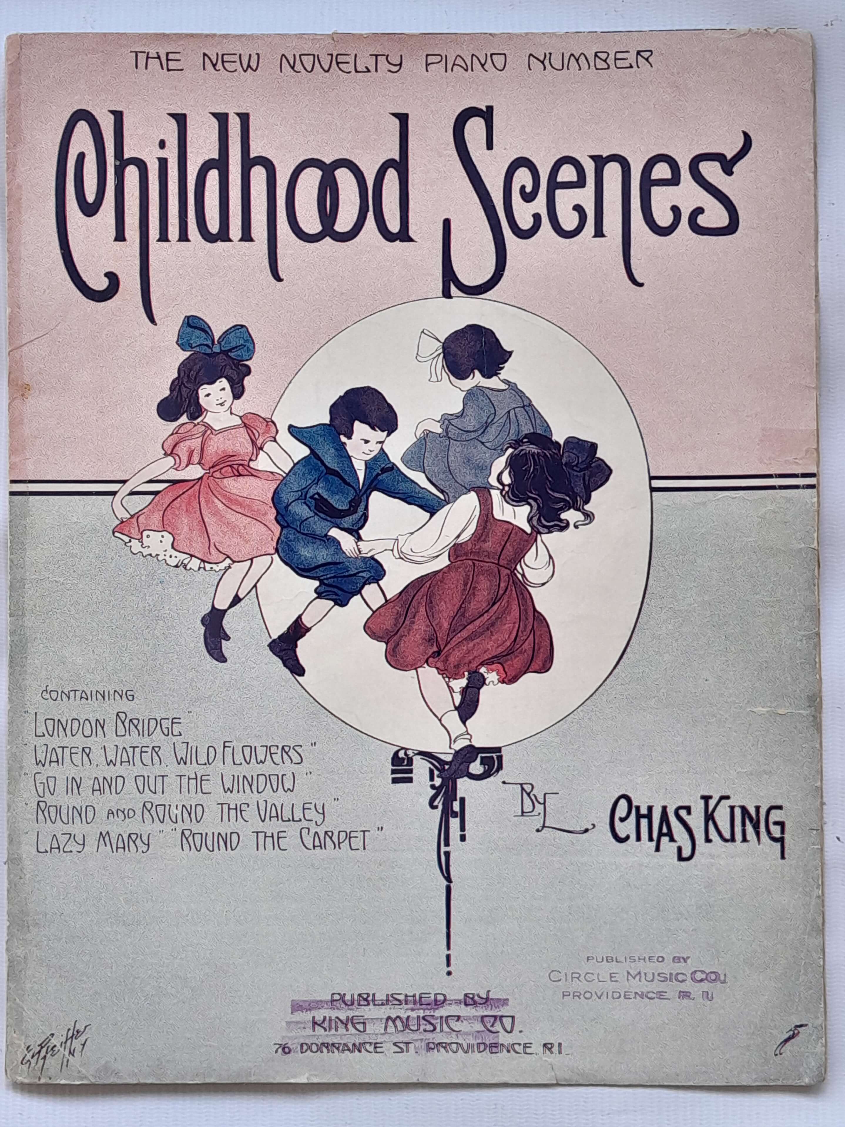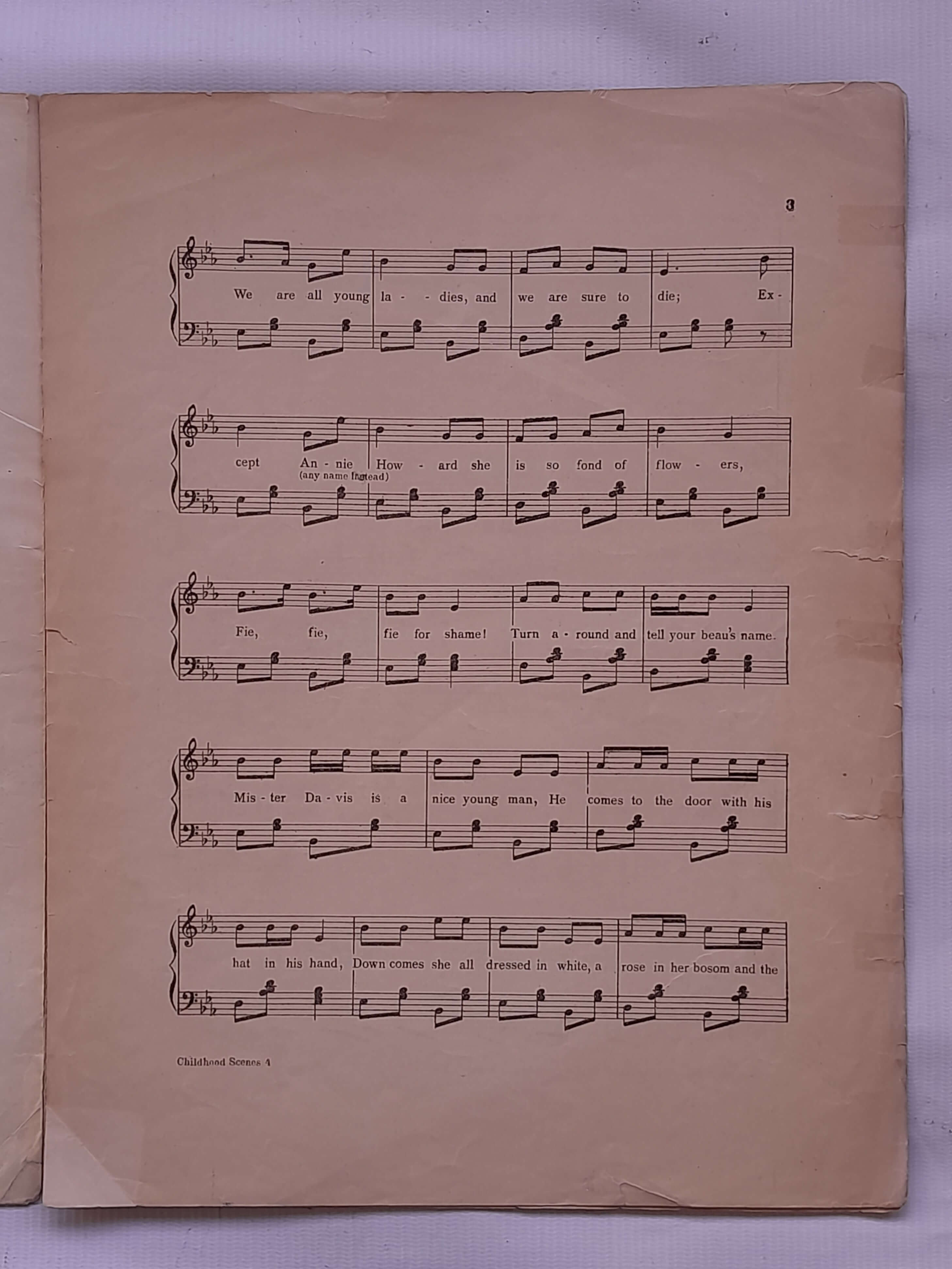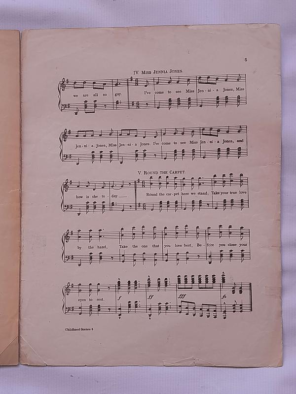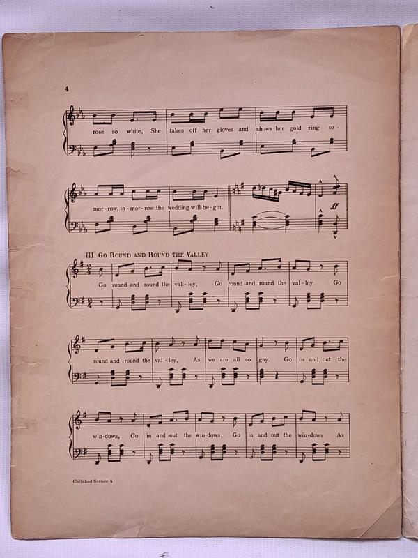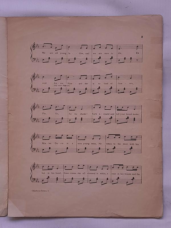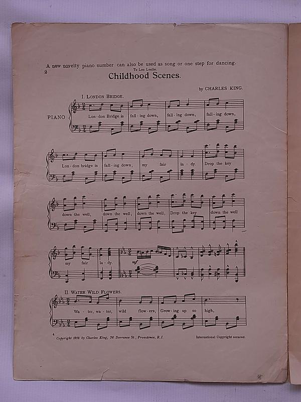 Partitura Childhodd Scenes By Chas king. Incluye 3 hojas o 6 páginas. Las hojas tienen desgastes y algunas rasgaduras, las pastas y la hoja del centro están unidas y reparadas con cinta pegante.