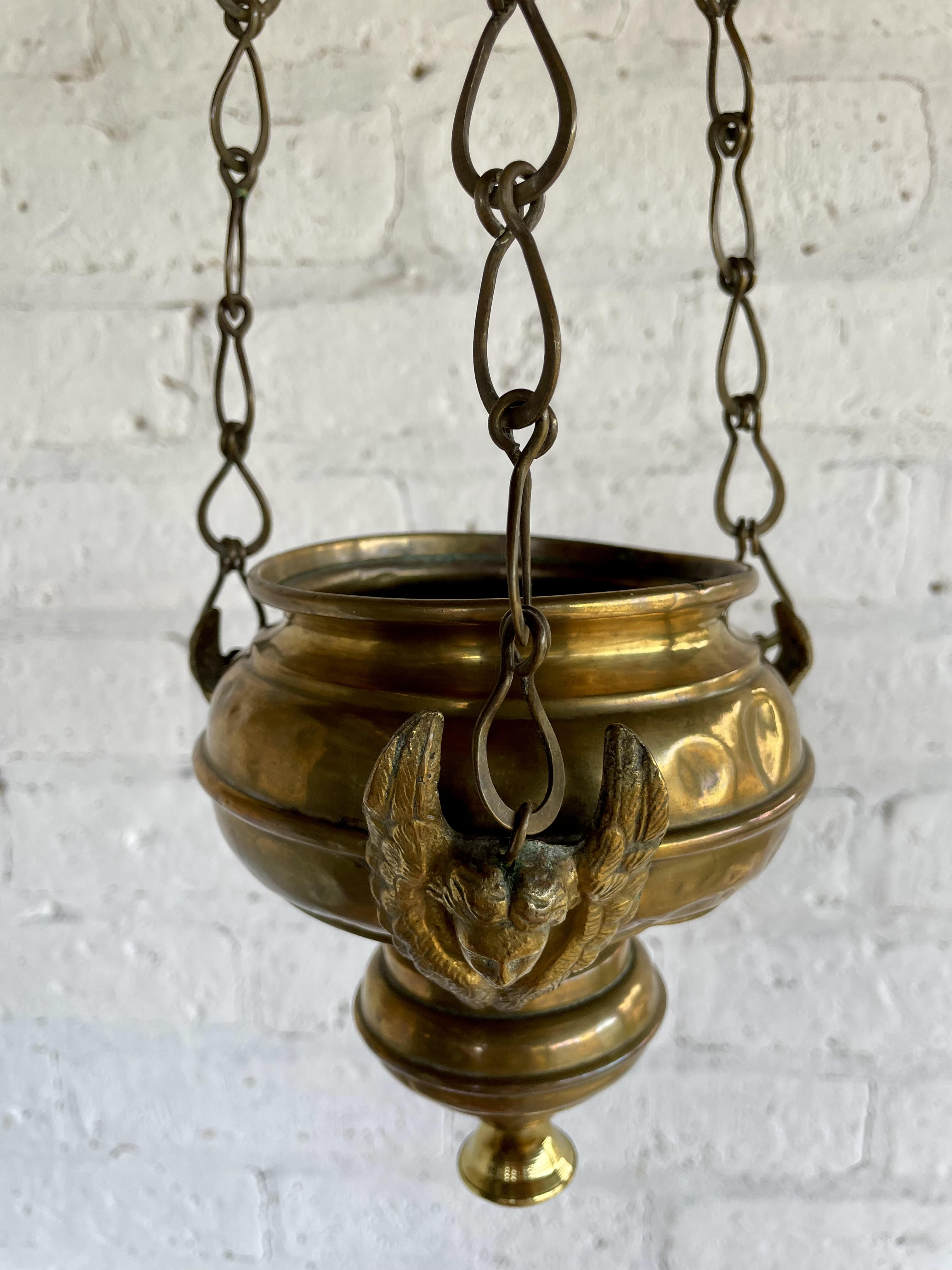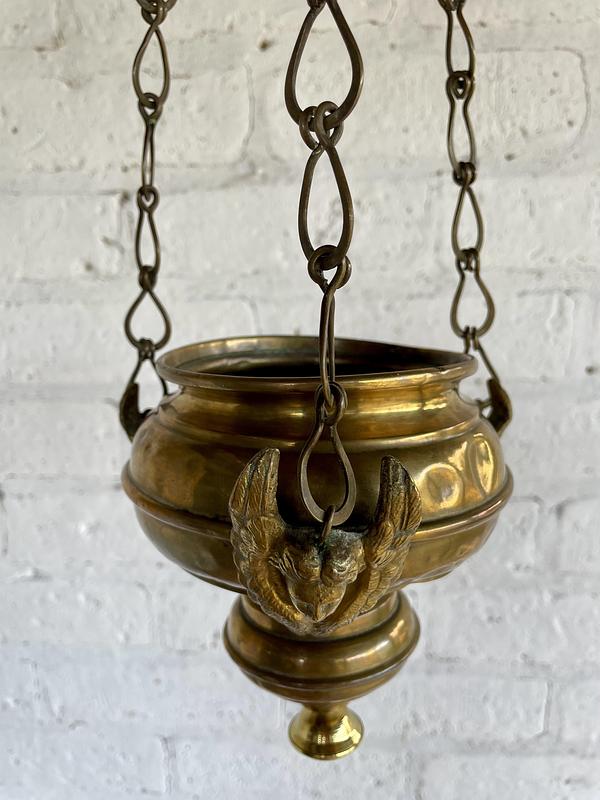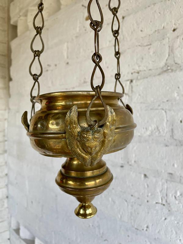 Lámpara votiva de santuario procedente de una colección de objetos religiosos españoles de principio del S XX. Elaborada en lámina gruesa de bronce, tres ángeles se encuentran en los puntos donde las cadenas se unen al cuenco inferior. Presenta desgaste con abolladuras y arañazos tiene una sumidura con un pequeño roto. Tener en cuenta que tiene más de un siglo.