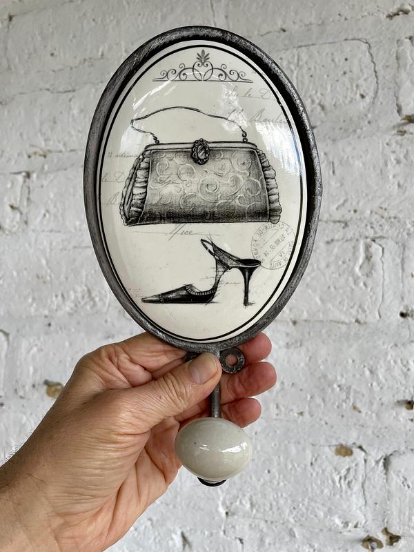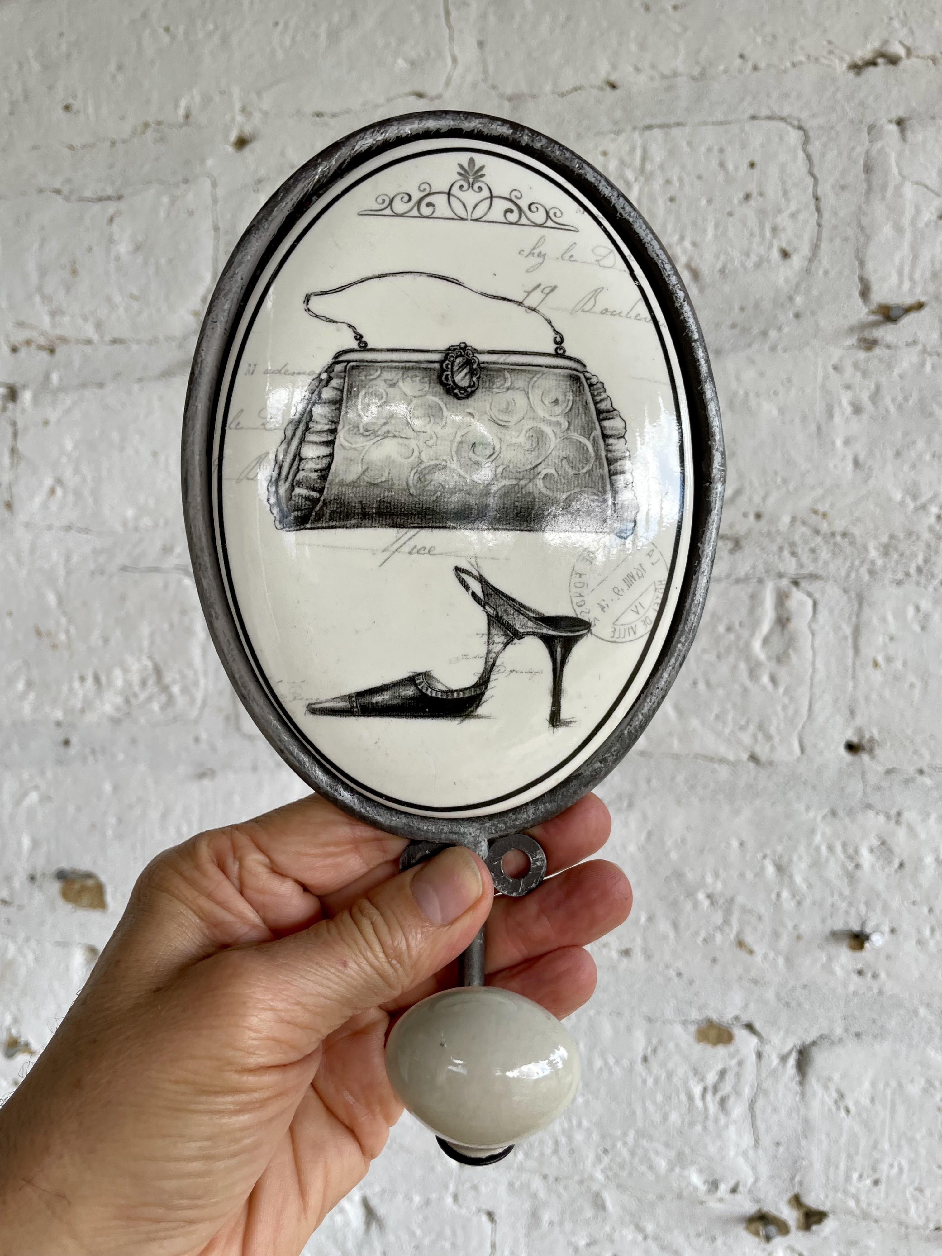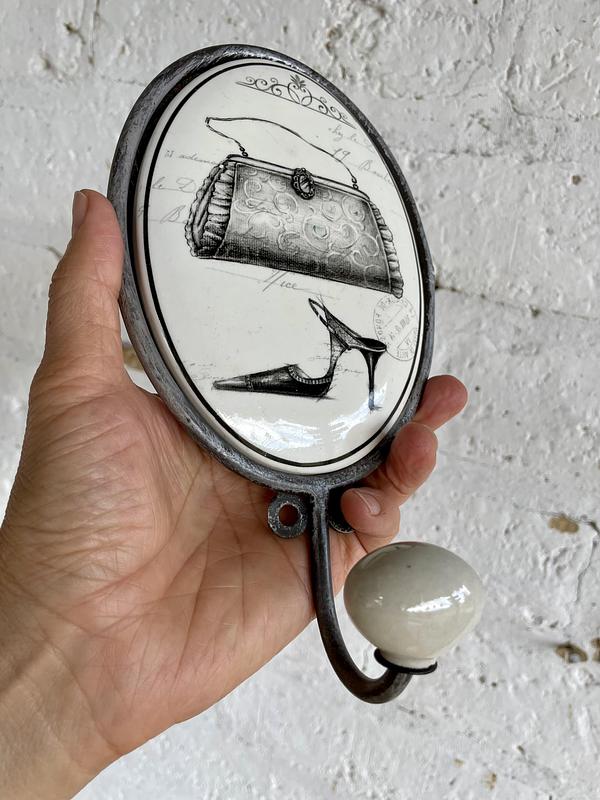Percha metálica recubierta con un medallón ovalado de porcelana, la perilla de la punta también es de porcelana.