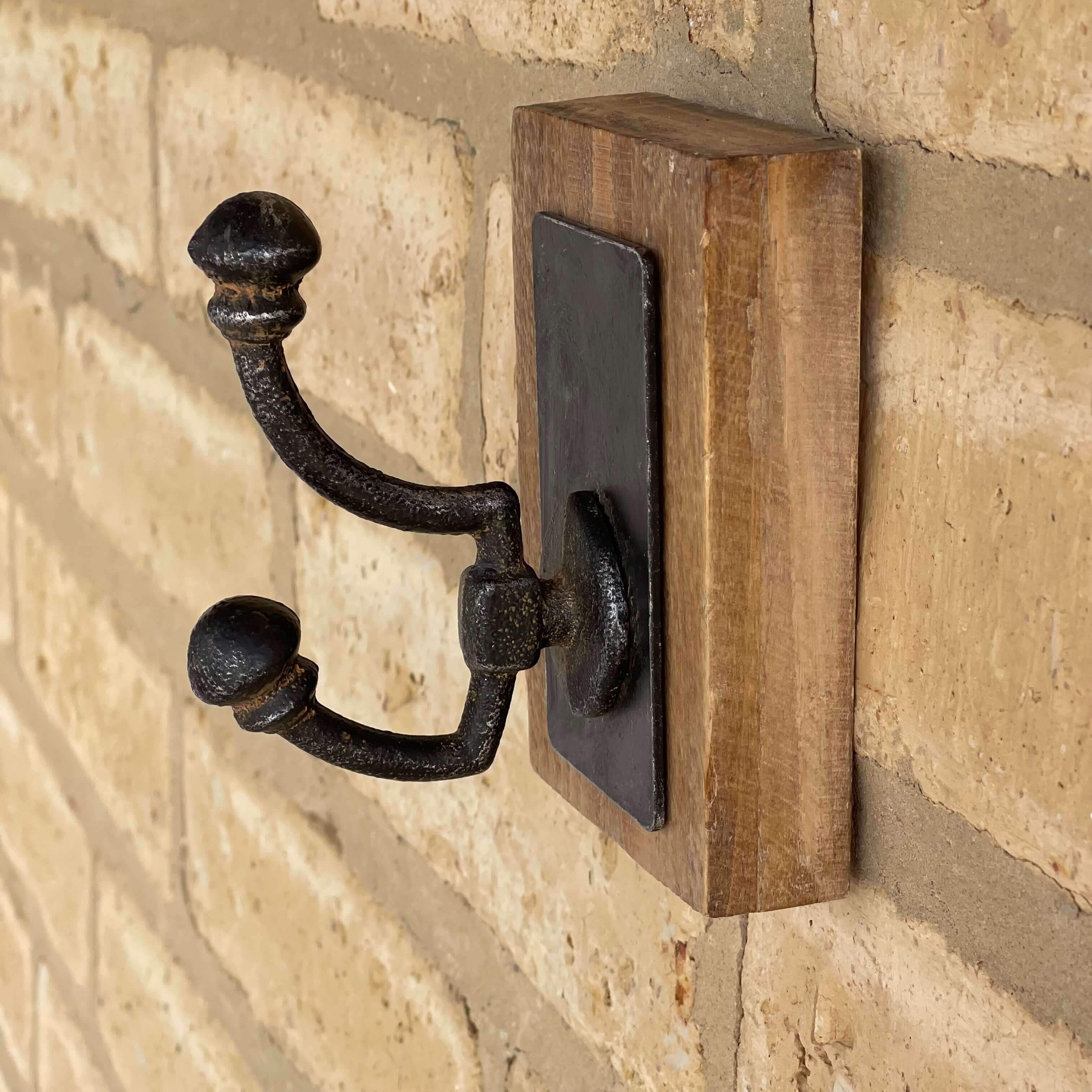 Percha retro en hierro fundido sobre base de madera.