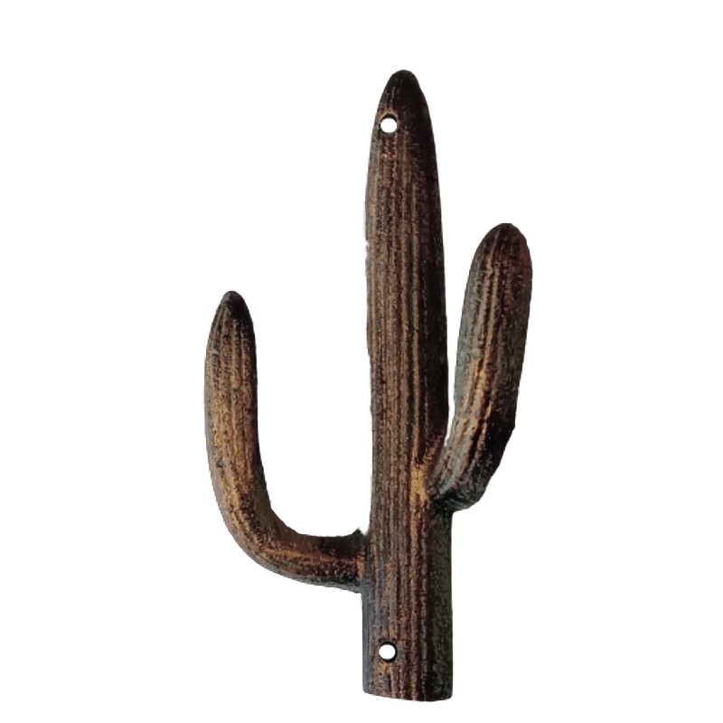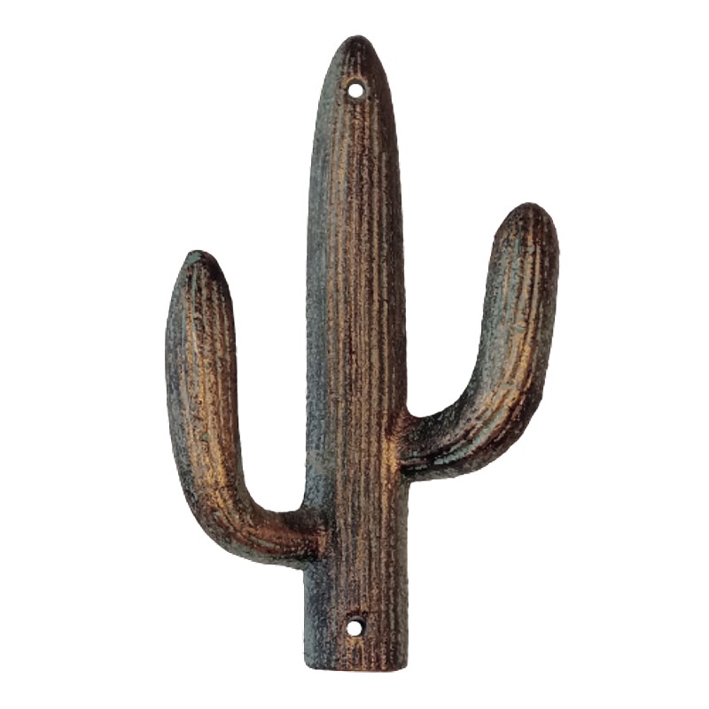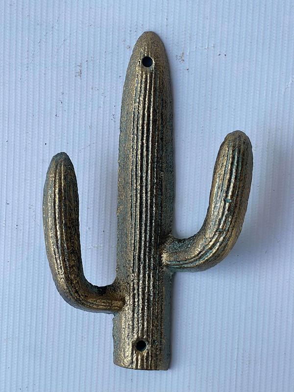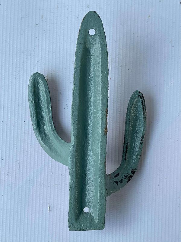 Percha metálica con forma de cactus decorada con pintura verde desgastada dándole apariencia antigua.