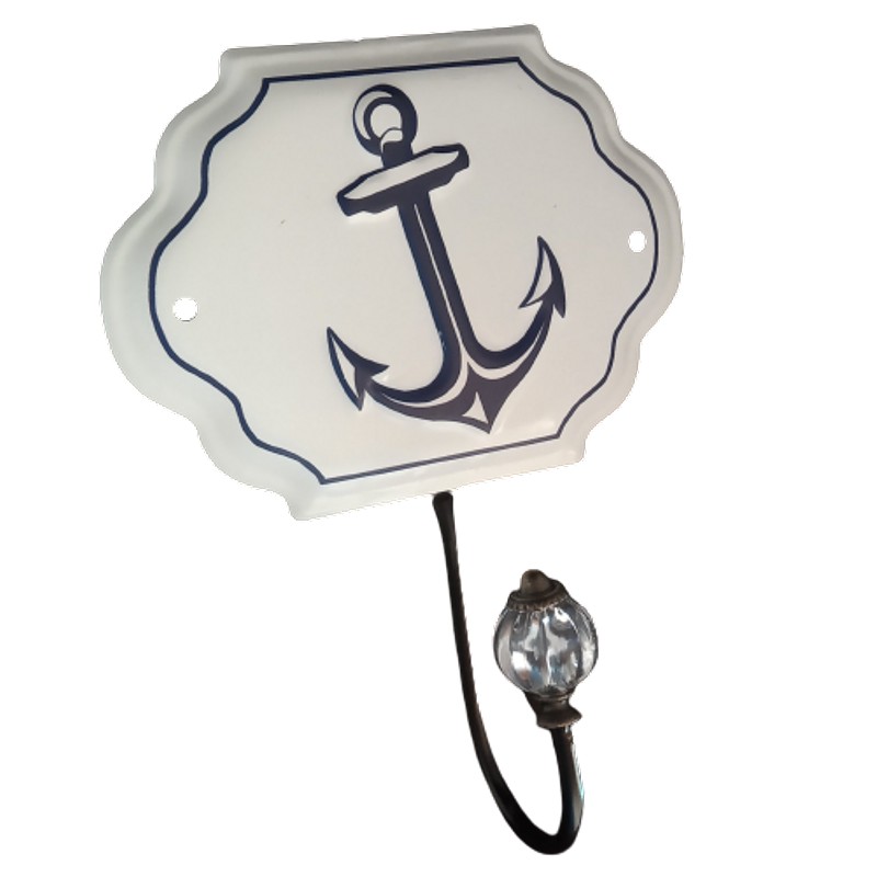 Colgador metálico esmaltado, en alto relieve decorado con una ancla azul, el gancho metálico tiene en la punta una esfera sintética.