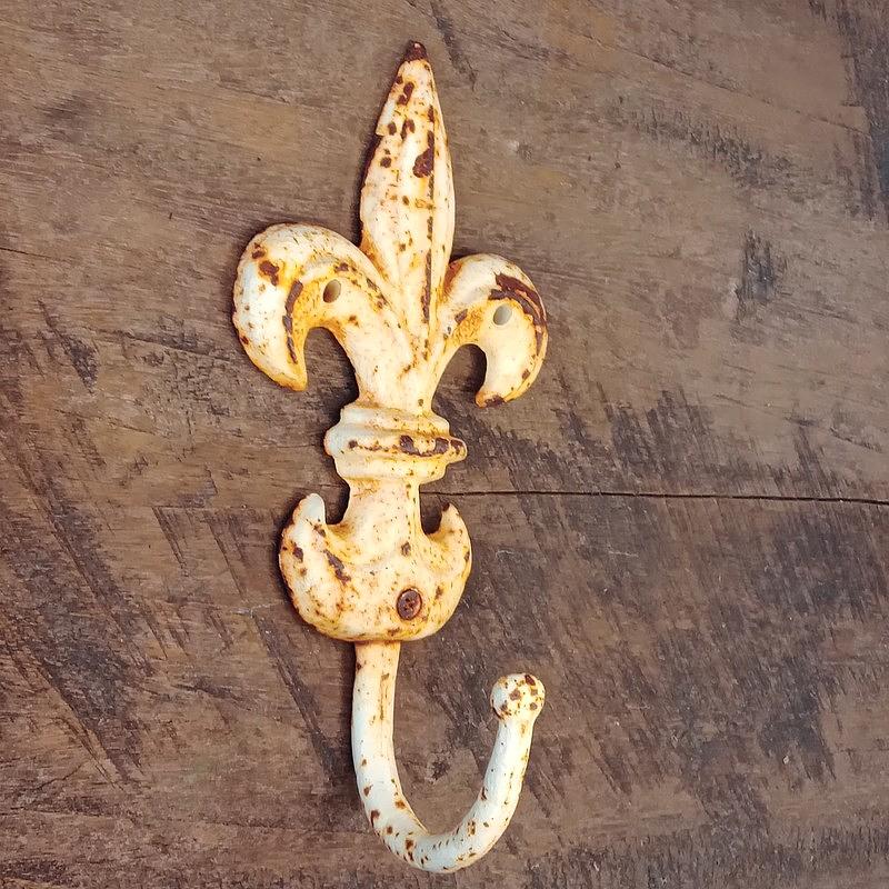 Percha en hierro con forma de flor de lis, decorada con pintura blanca oxidada dandole apariencia de antigua.