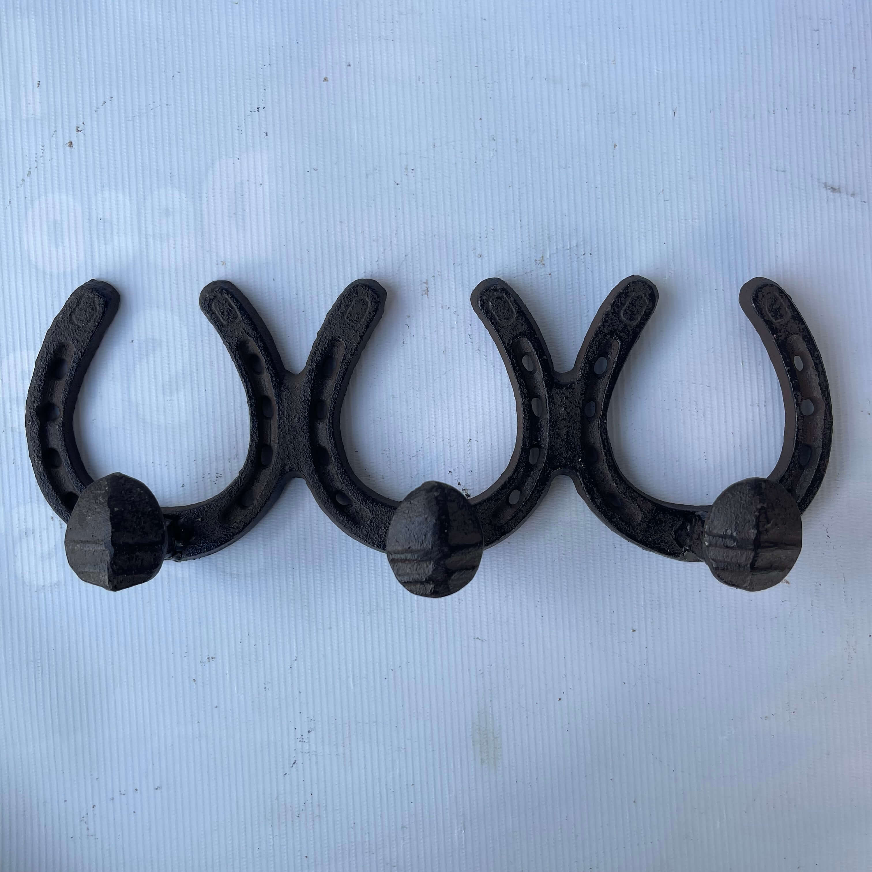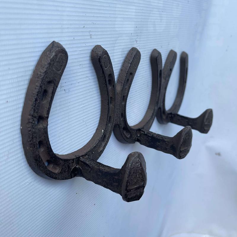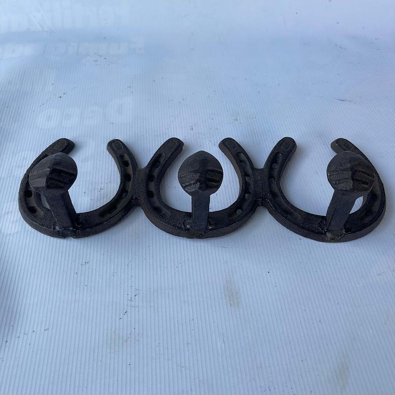 Perchero de hierro fundido en una sola pieza formado por 3 herraduras cada una con un clavo de ferrocarril a manera de gancho.