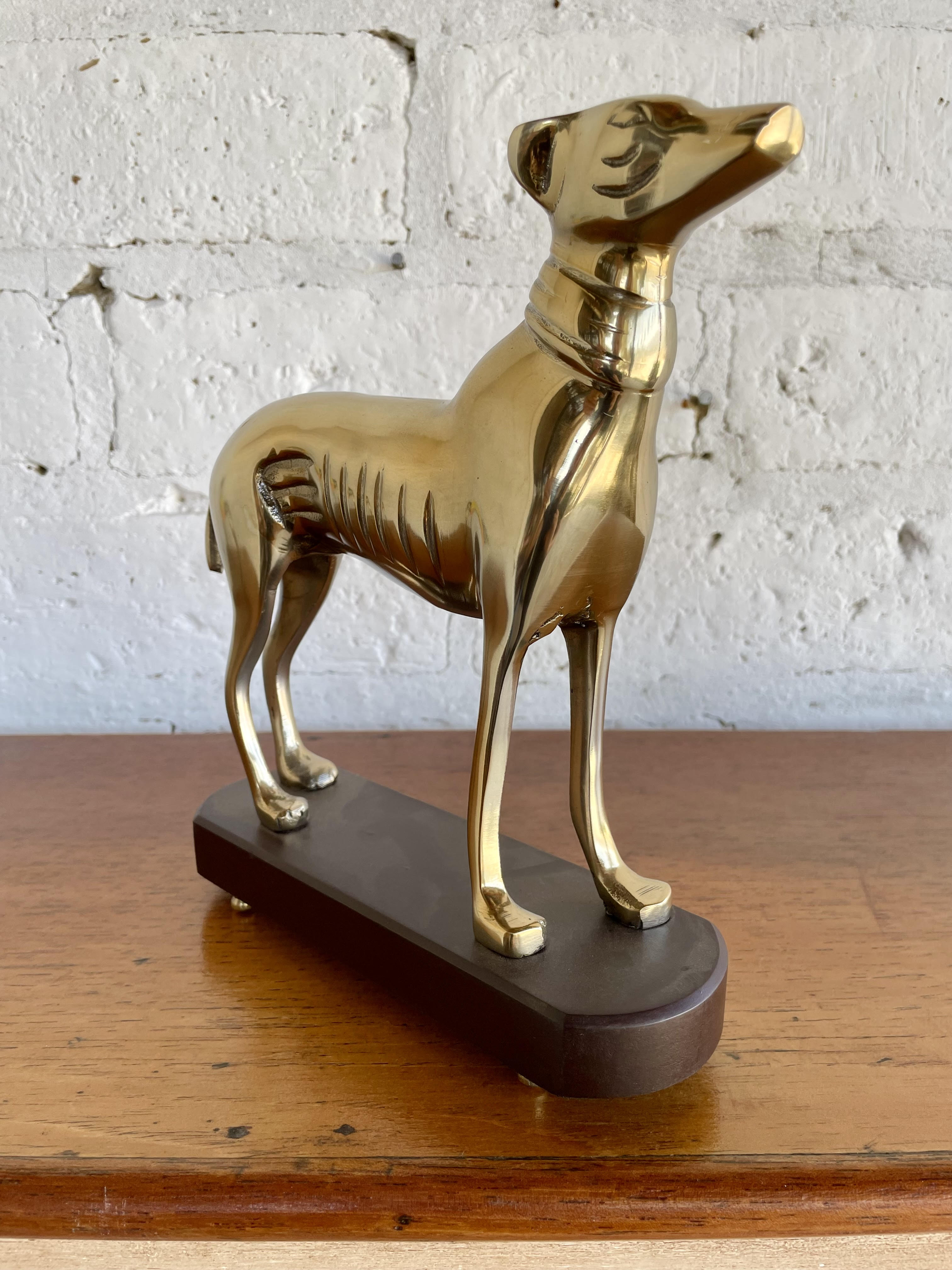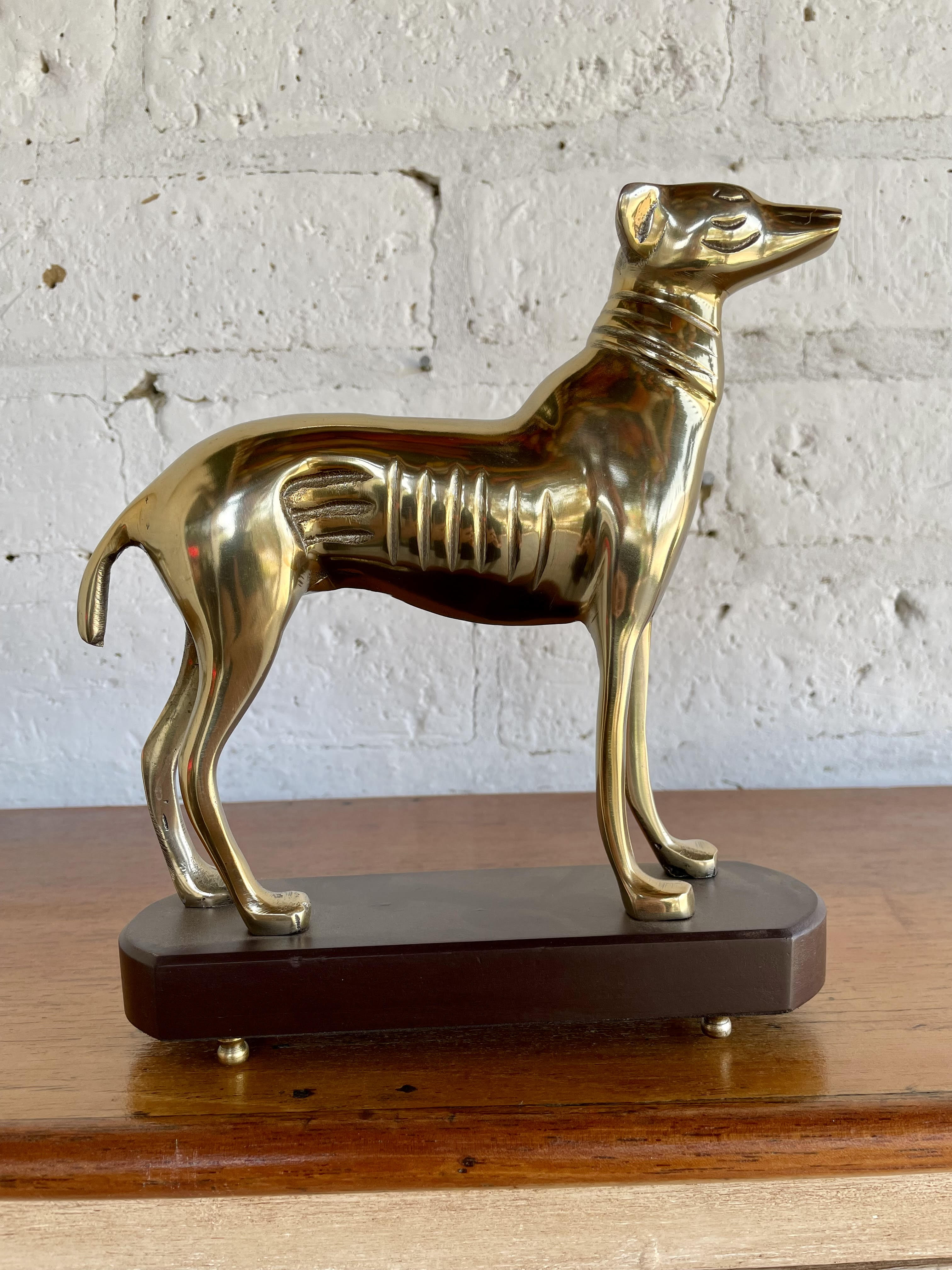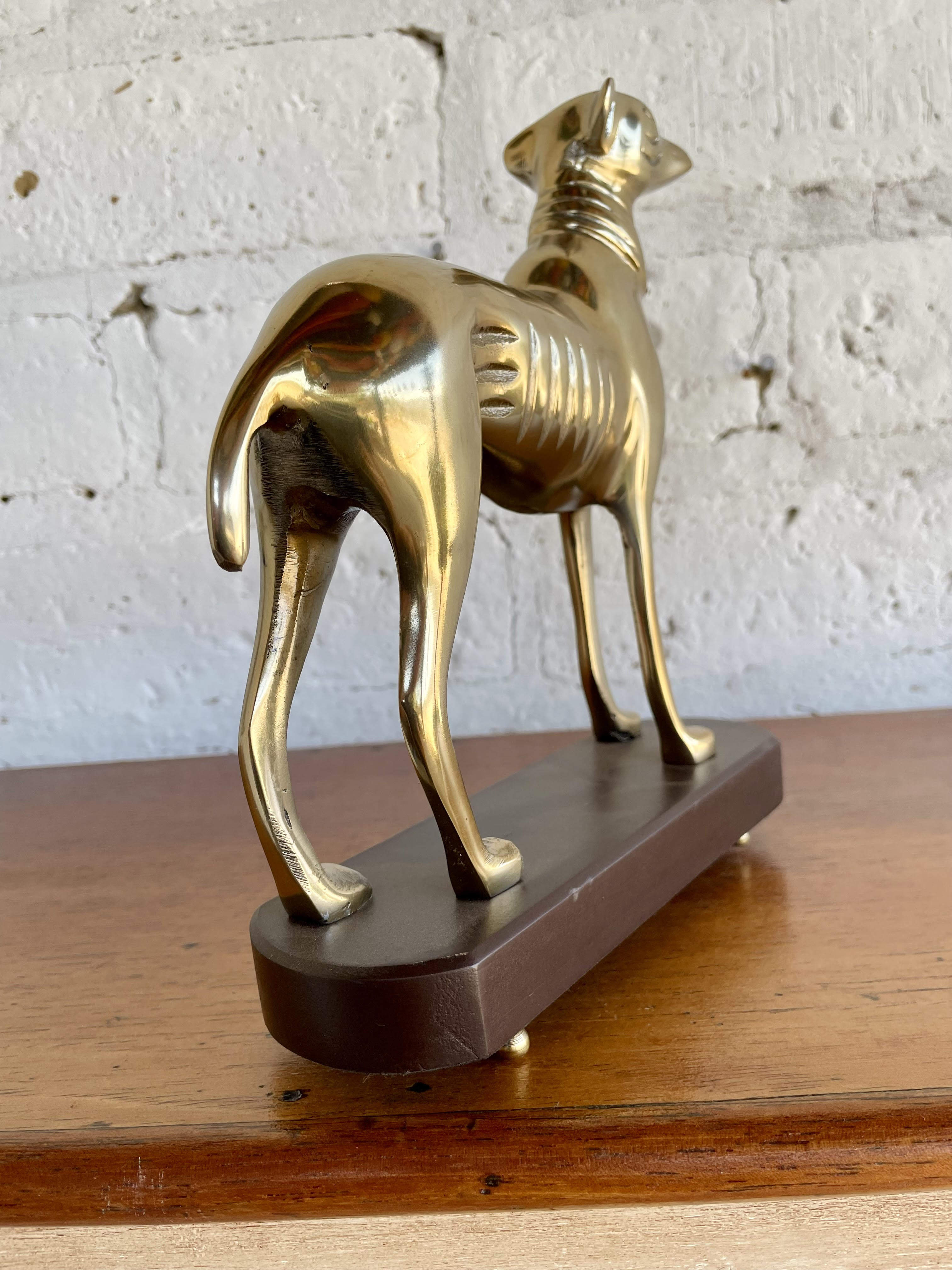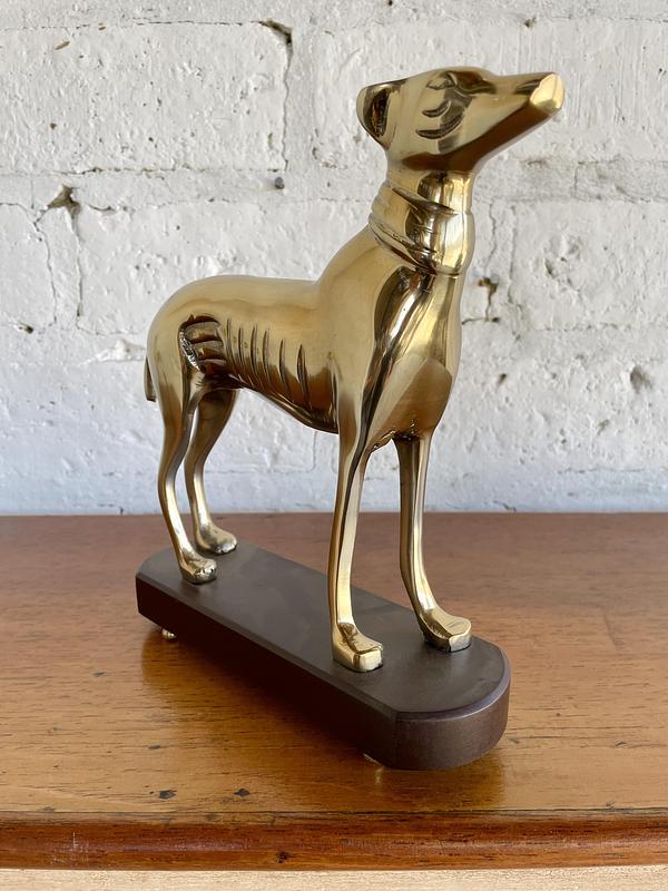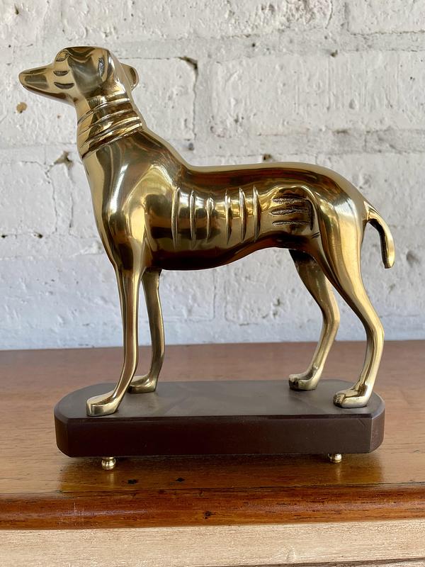 Figura de perro en aluminio sobre base de madera.