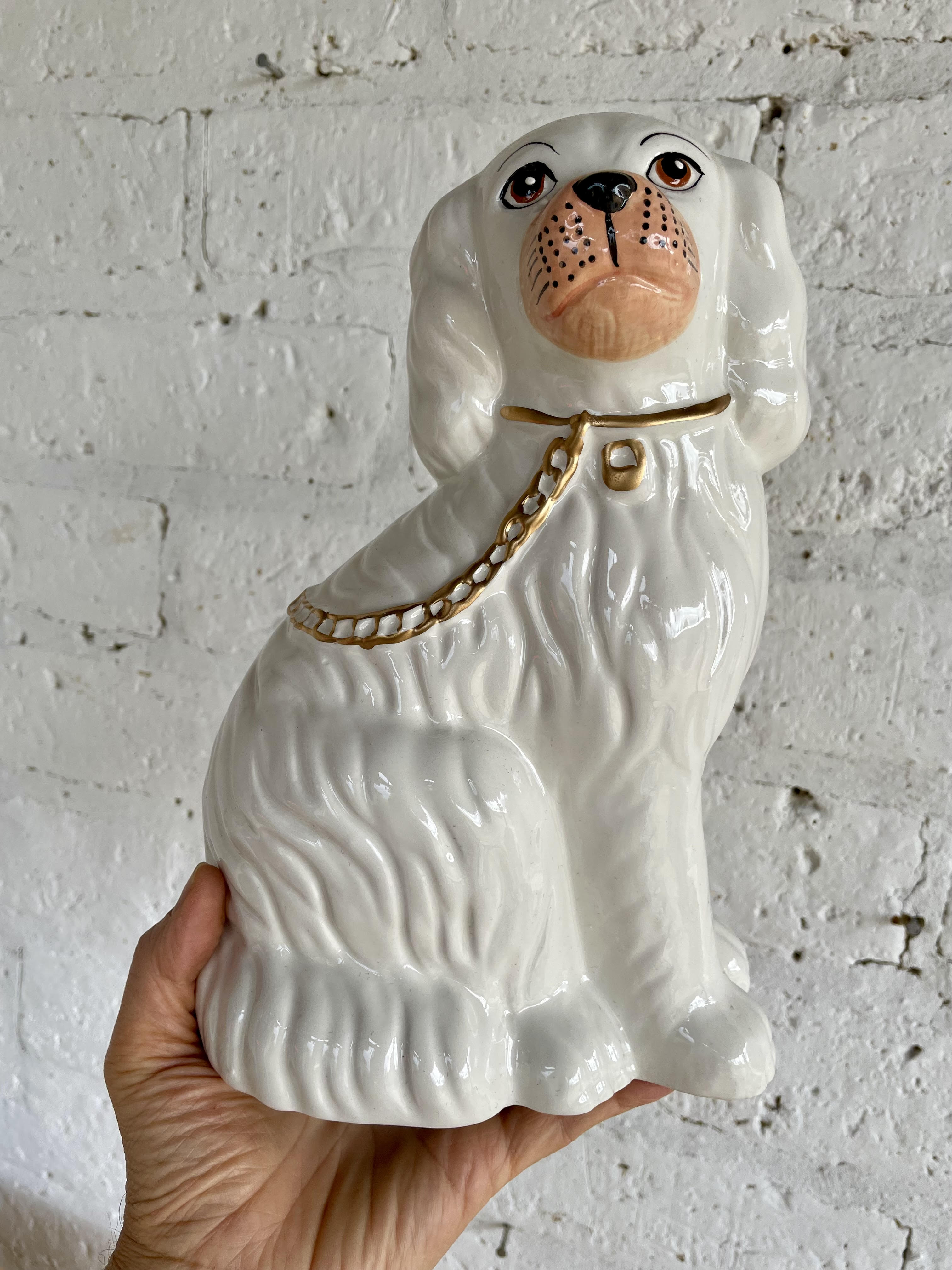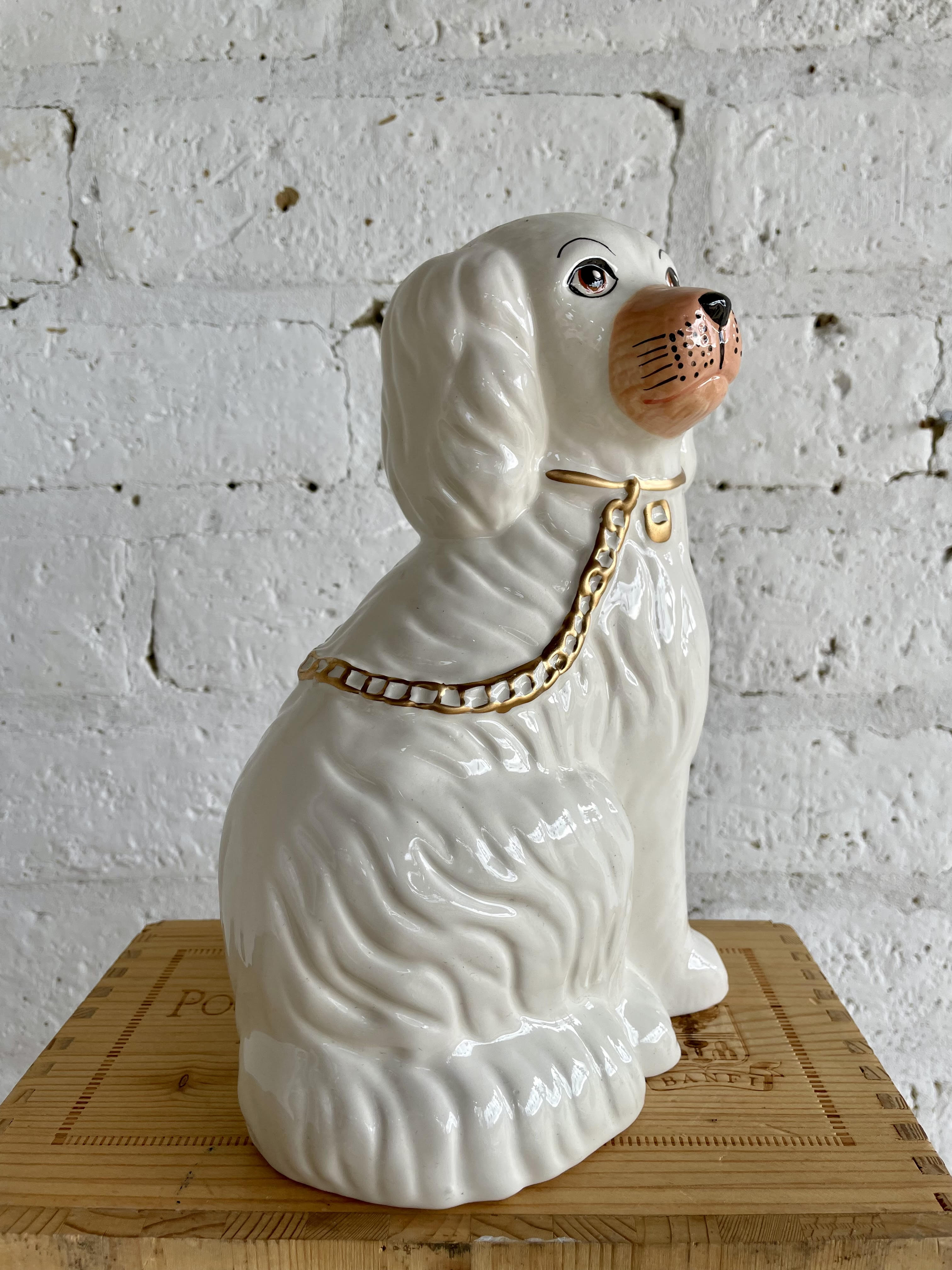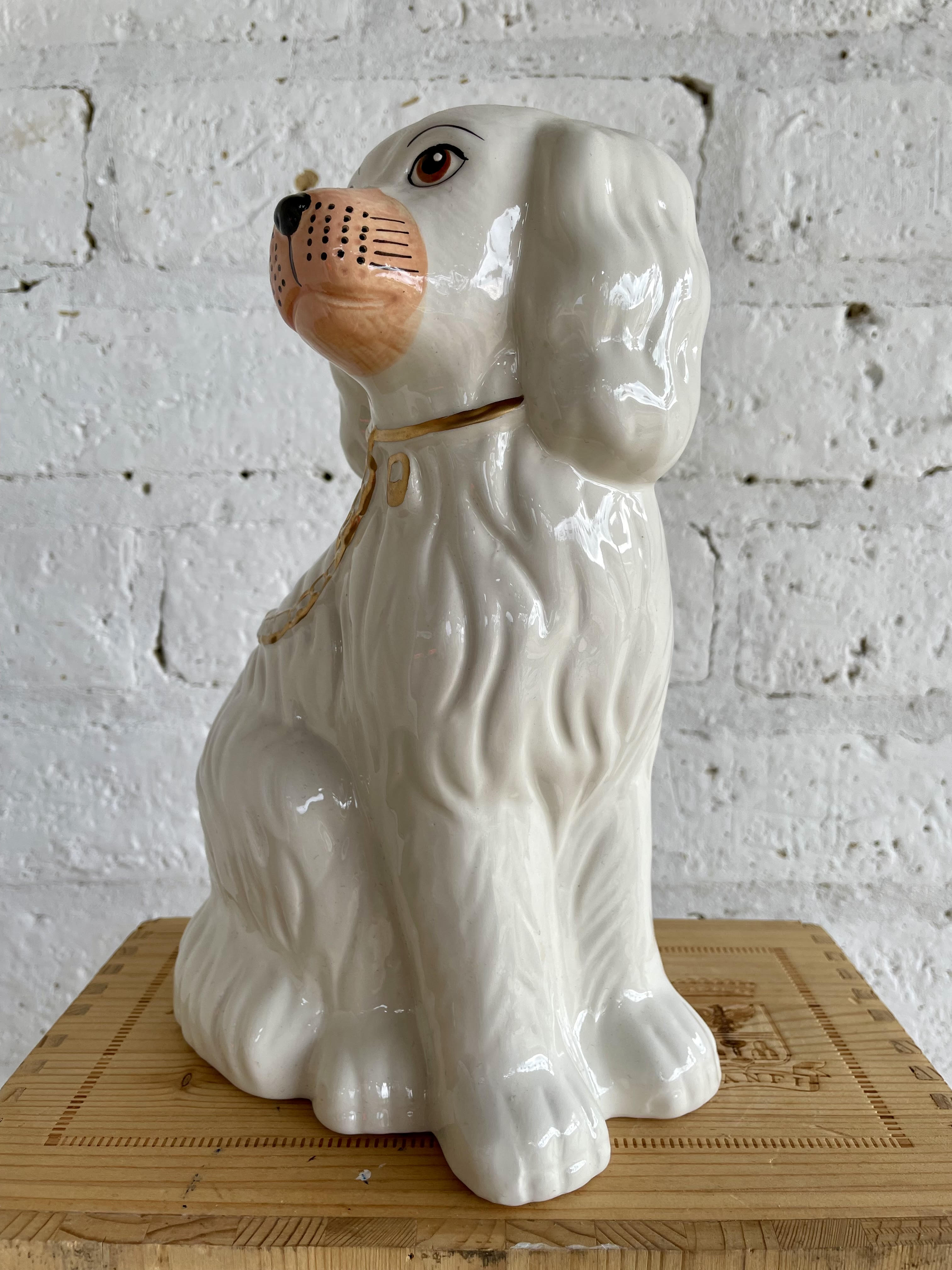 Esta figura de un perro Spaniel elaborado en porcelana y pintado a mano con la clásica cadena dorada se encuentra en buen estado.
