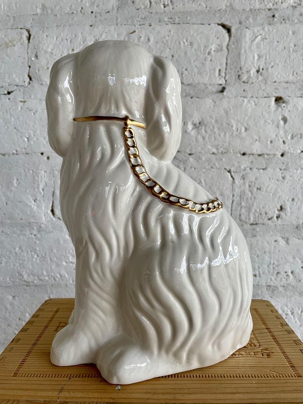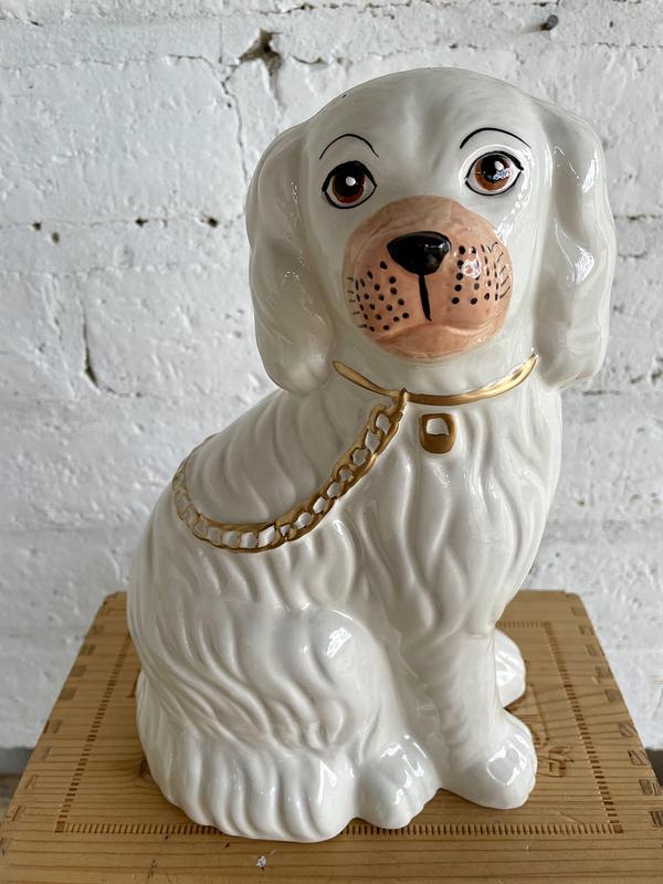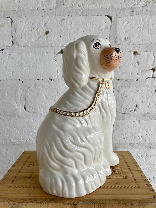 Perro de porcelana (solamente hay uno disponible) mirando hacia la derecha. Las figuras de perros para chimenea se originaron en la época Victoriana en Stanffordshire (Inglaterra) y continuan siendo piezas apetecidas por decoradores y coleccionistas.