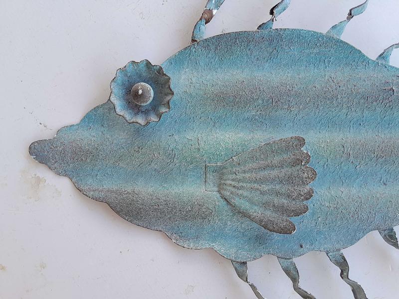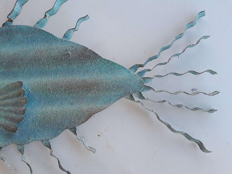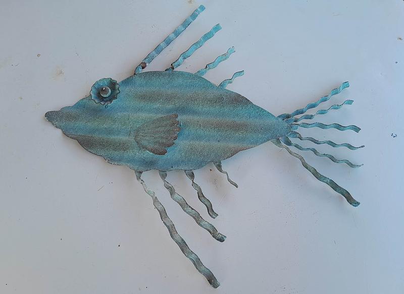 Pequeña escultura en teja metálica reciclada, pintada en verde desgastado.