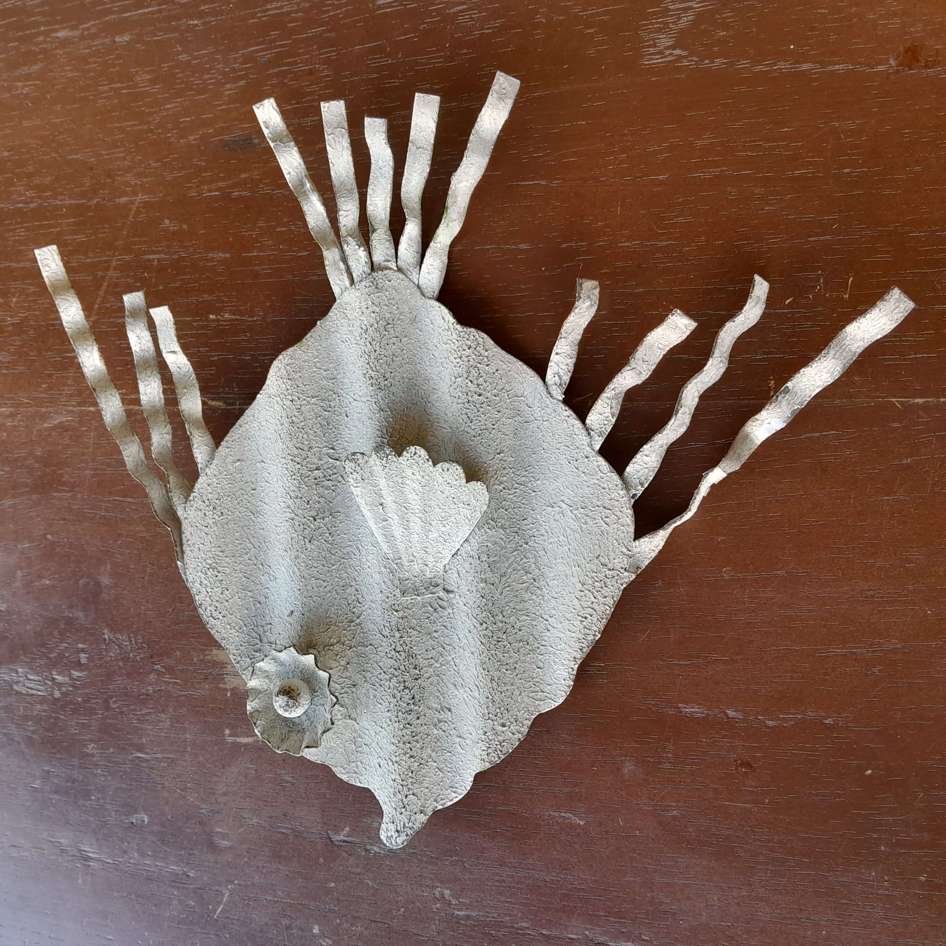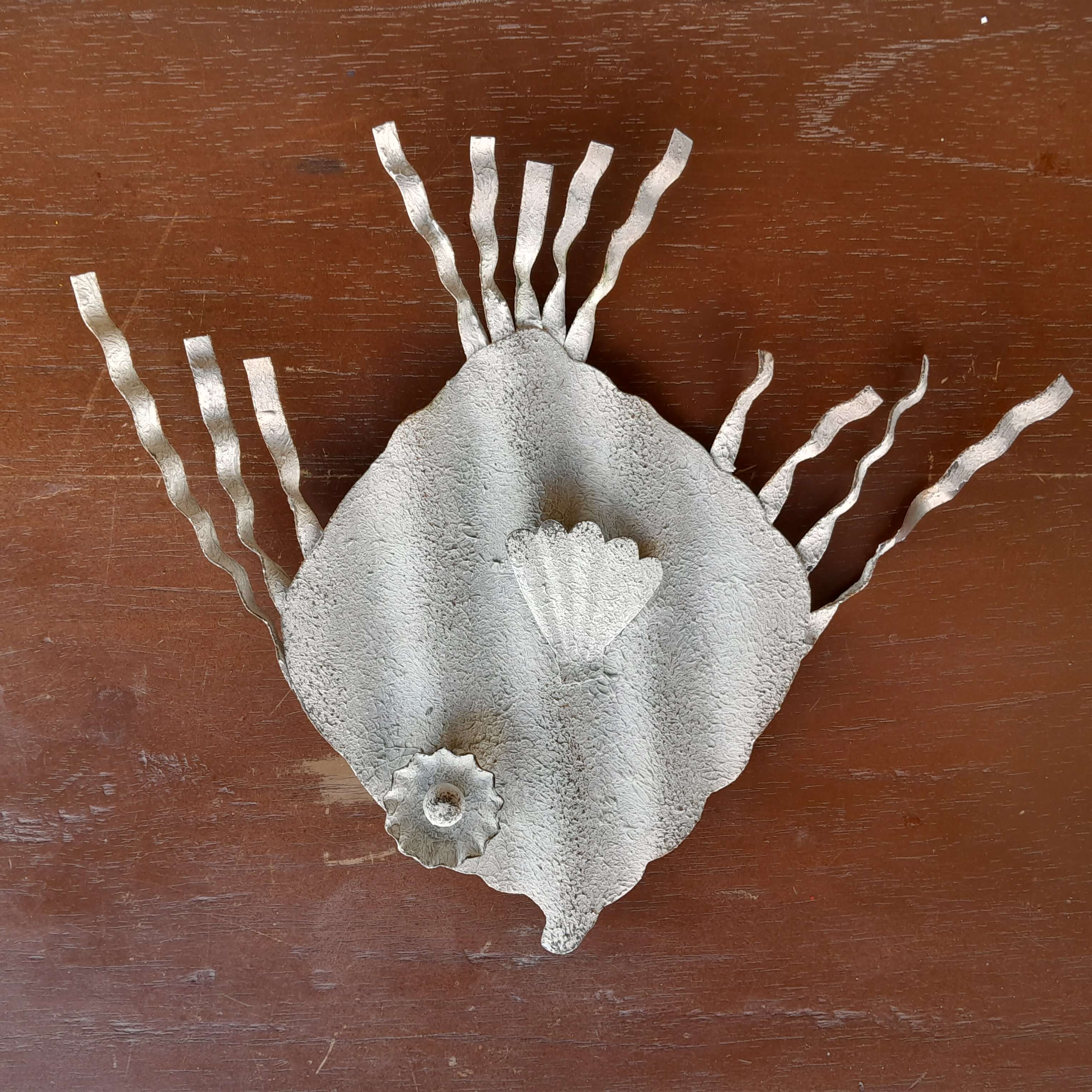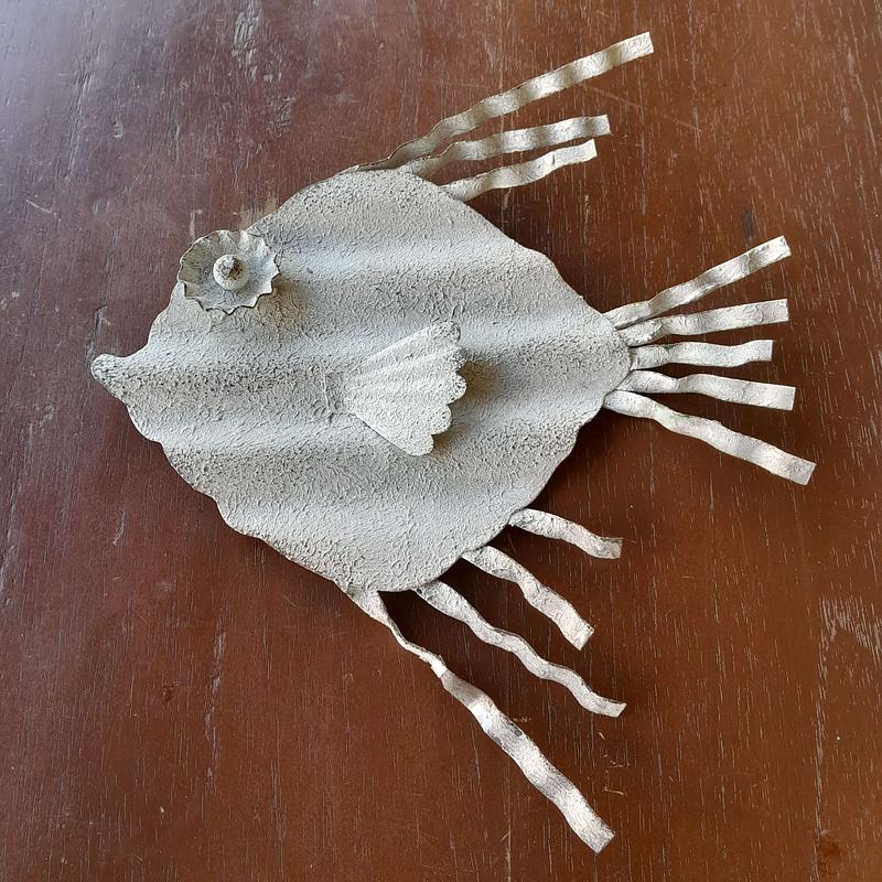 Pez artesanal elaborado en teja de zinc reciclada, el ojo se armó con una tapa de cerveza.