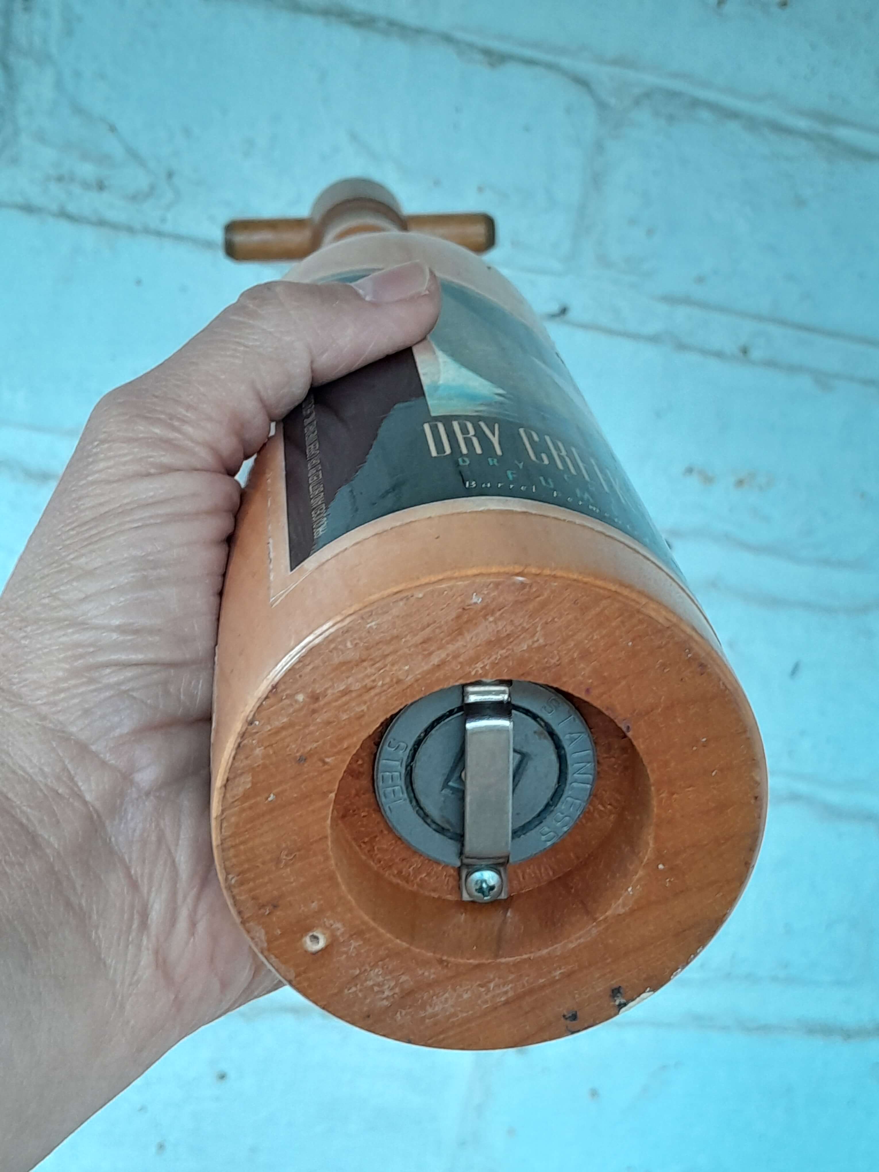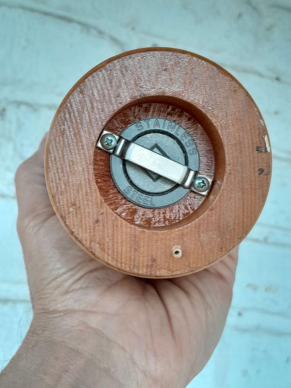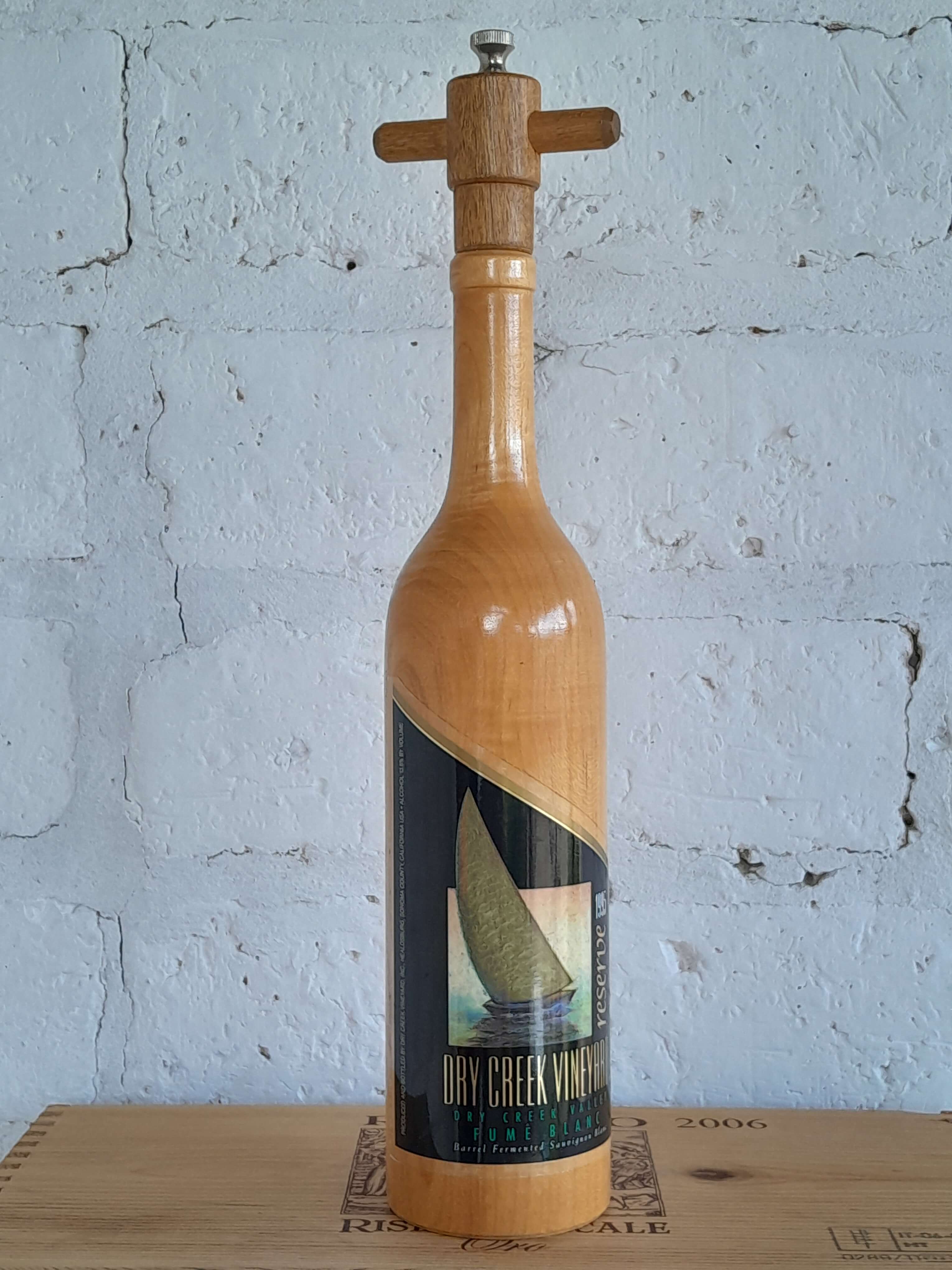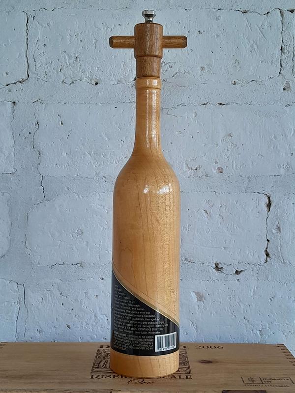 Pimentero elaborado en Estados Unidos en madera de ébano por Wine Enthusiast, el sistema de molino es de acero inoxidable y cerámica anodizados para proteger contra la corrosión. Ha sido decorado con una etiqueta de un Fumé Blanc reserva 1995 de un viñedo del Valle de Sonoma en California.