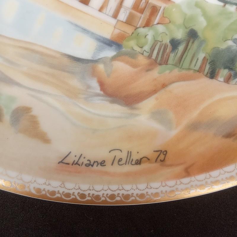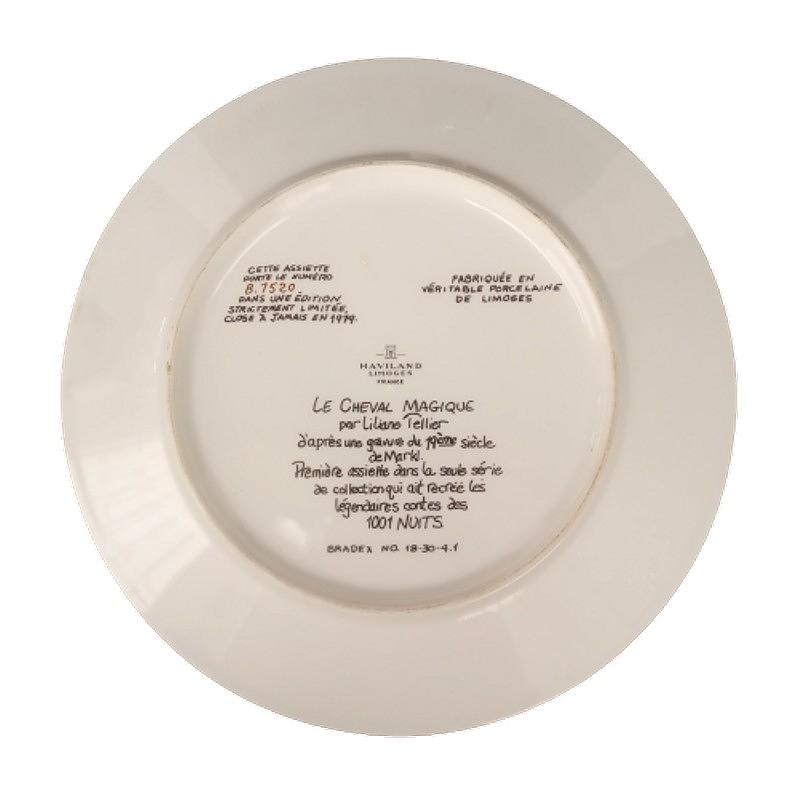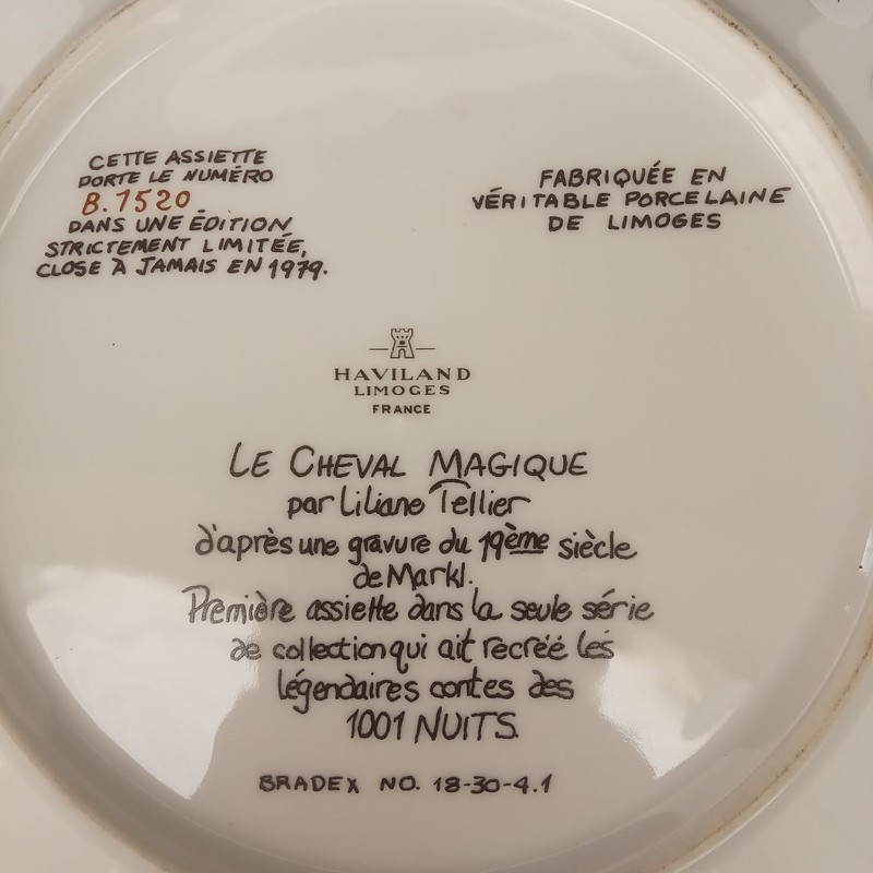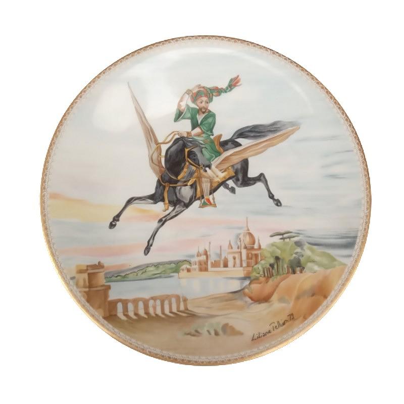 Plato francés pintado por la artista francesa Liliane Tellier 1979, ilustra la historia del caballo encantado del famoso libro de las mil y una noches. Producido por Haviland Limoges. Numerado B 1520.