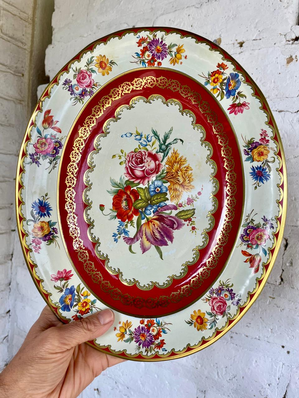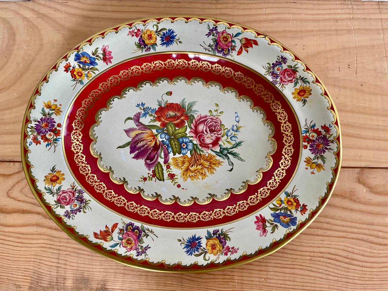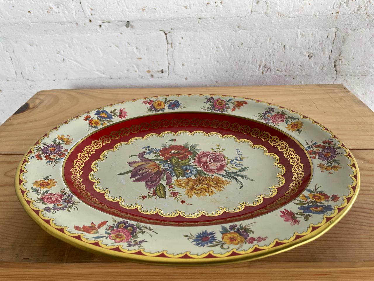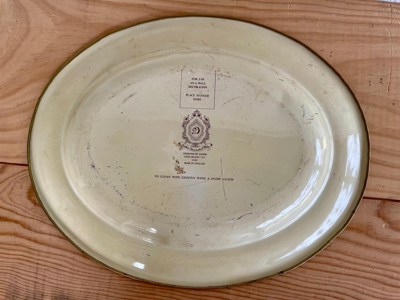 Bandeja metálica diseñada por Daher long Island - N.Y. y fabricada en Inglaterra en los años setenta. Decorada con pintura horneada en tonos rojos y dorados. Se encuentra en buen estado con algunos desgastes en la pintura por el uso.