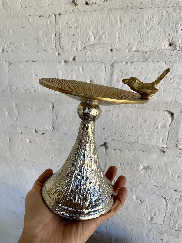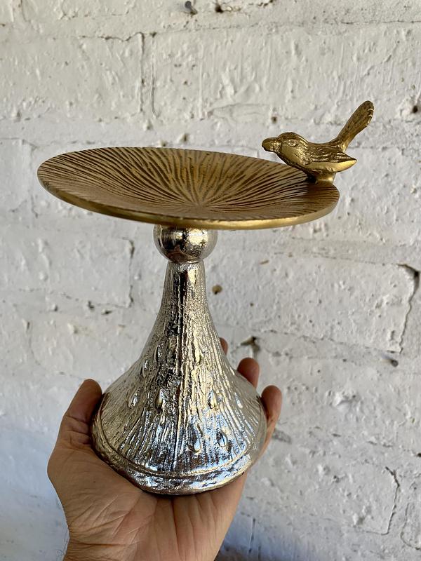 Plato y pajarito metálicos decorado en colores plata y oro.