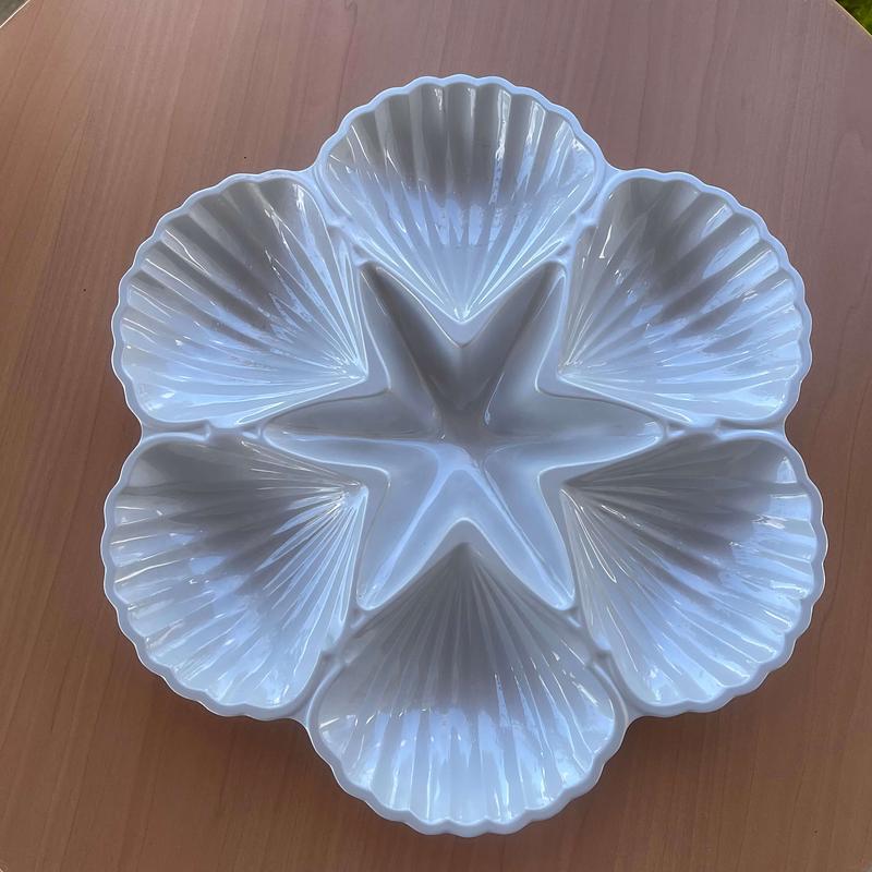Recipiente en melamina. Bandeja pasabocas en forma de vieiras y estrella de mar.
