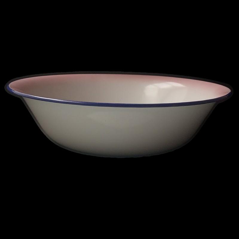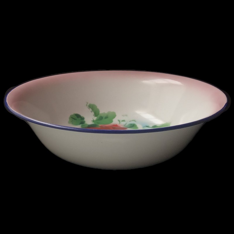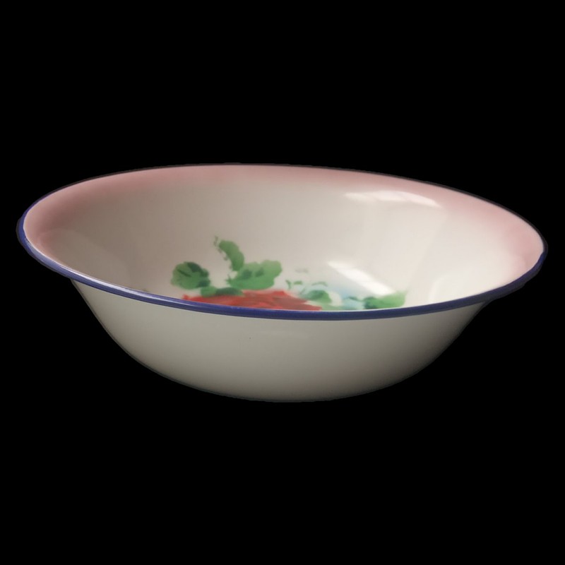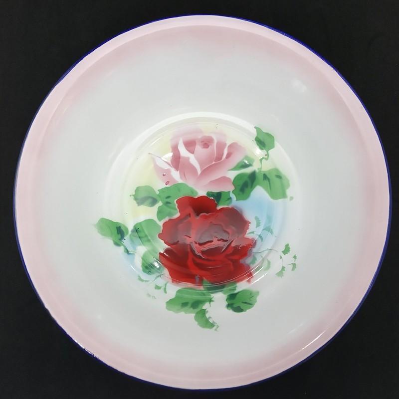 Platón metálico esmaltado en blanco y decorado con flores en el fondo, con apariencia de un recipiente antiguo.