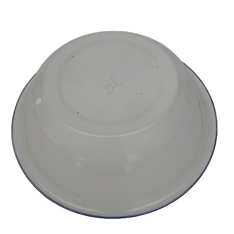 Platón metálico esmaltado en blanco y decorado con flores en el fondo, con apariencia de un recipiente antiguo. Producido por Butterfly Brand, China.