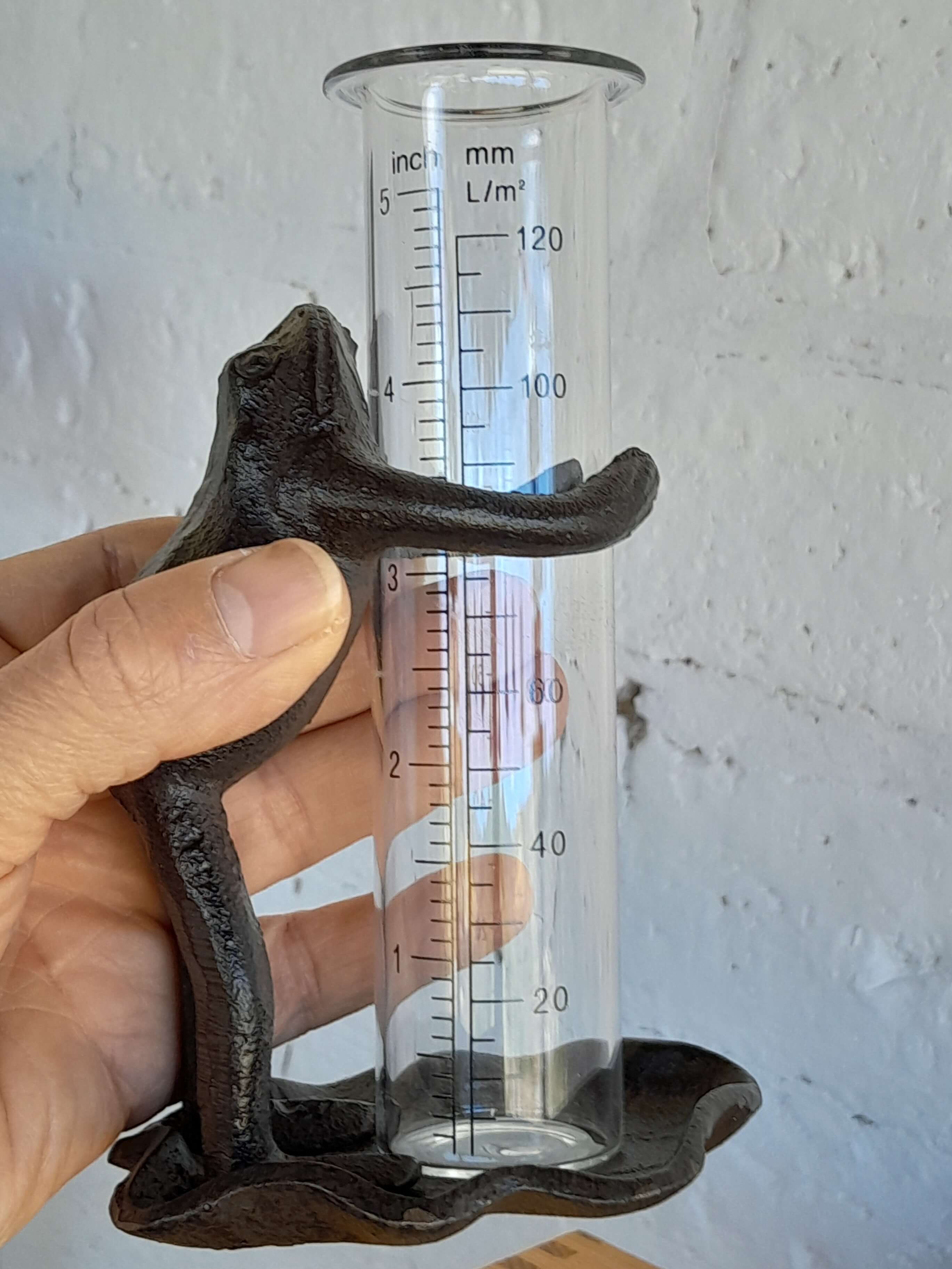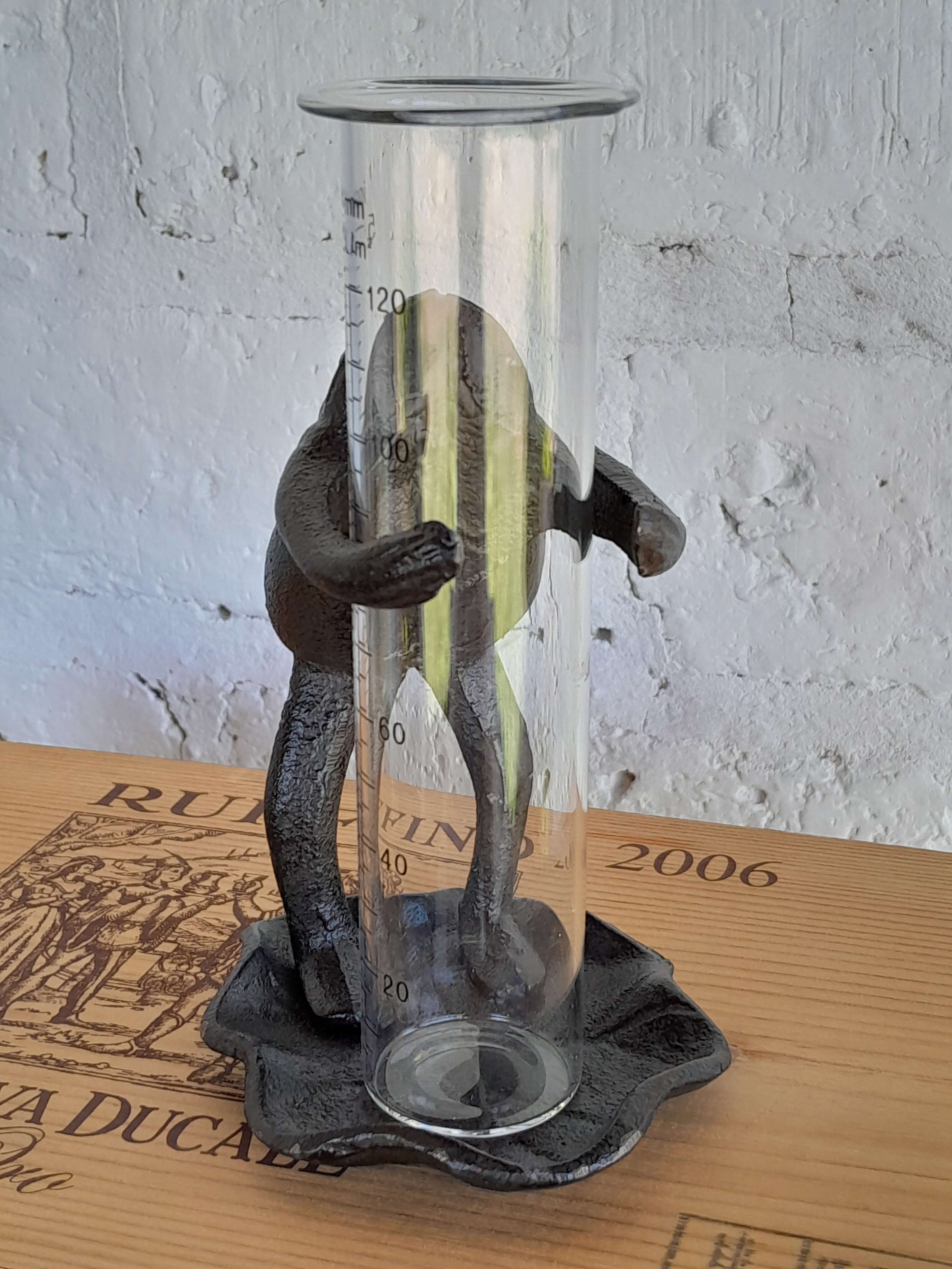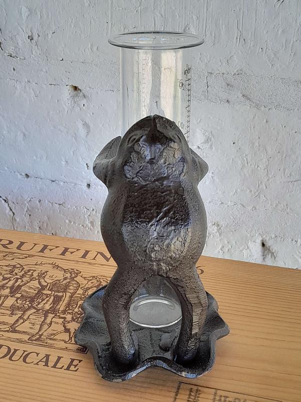 Un sapo de hierro fundido es el soporte del tubo de vidrio de este pluviómetro, ideal para medir la lluviosidad decorando el jardín.