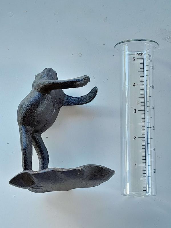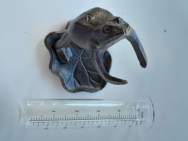 MEDIDAS: Sapo: Alto 12 cm. Largo 10 cm. Ancho 8 cm. Pluviómetro: Alto 15,5 cm. Diámetro 5 cm. Capacidad 120 mm
