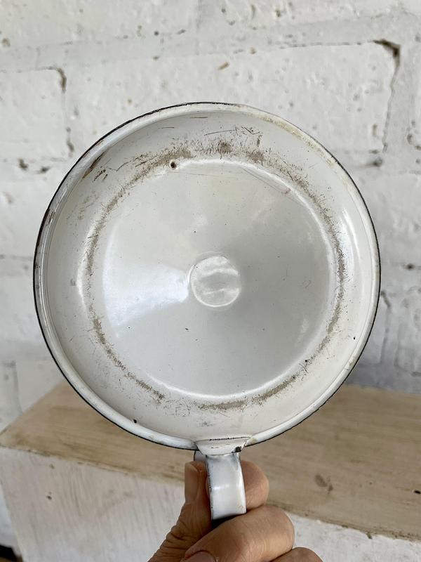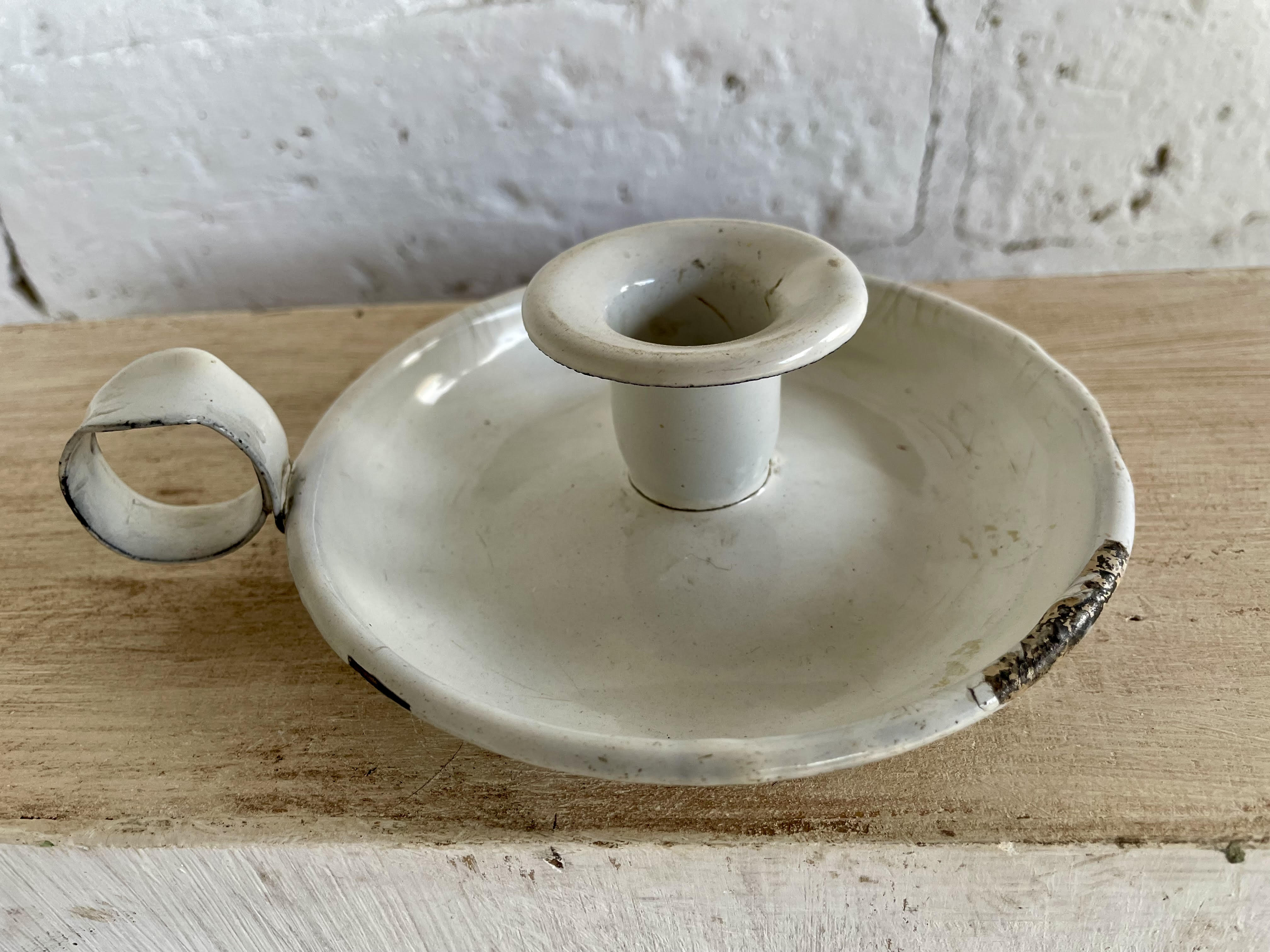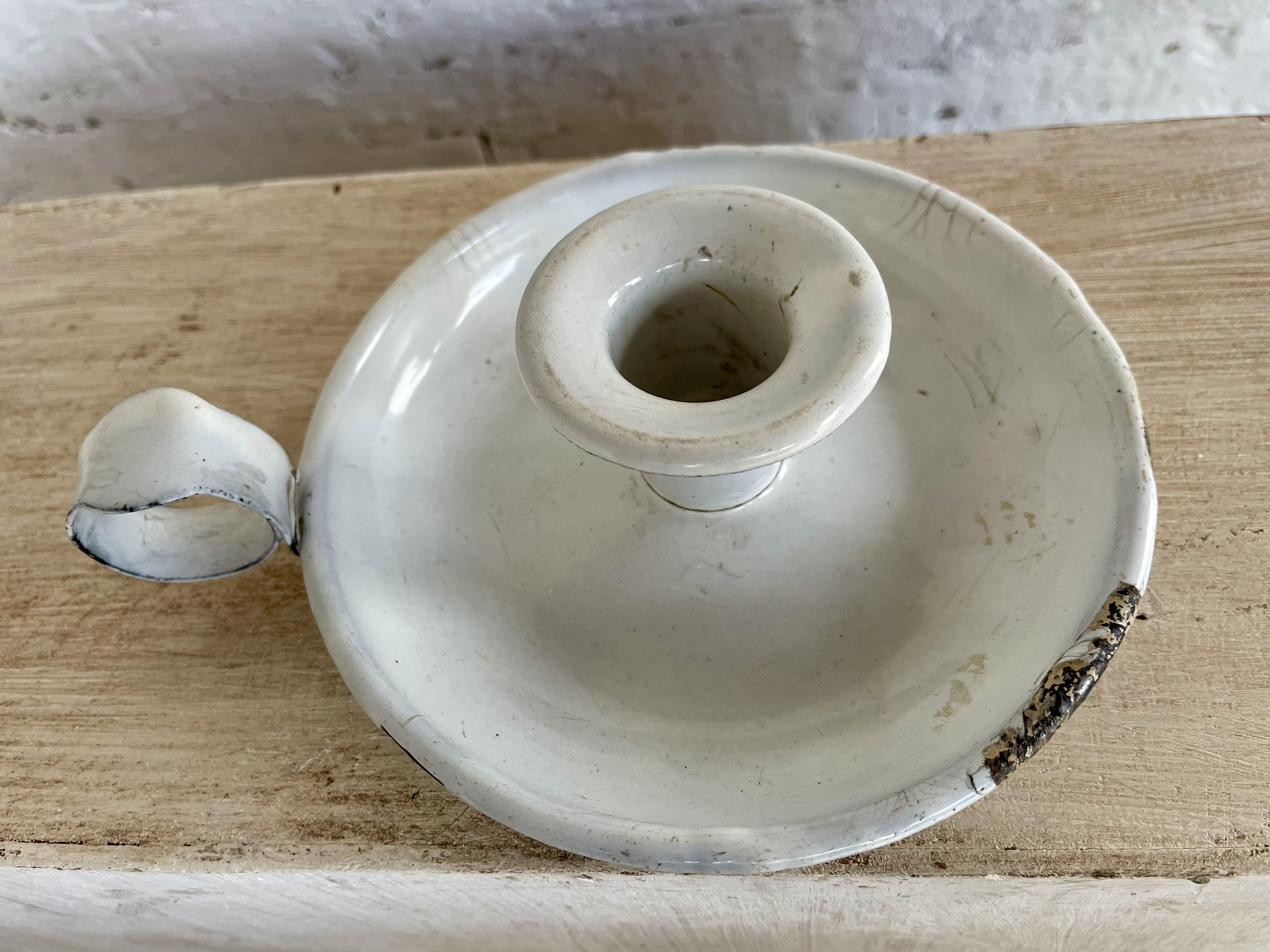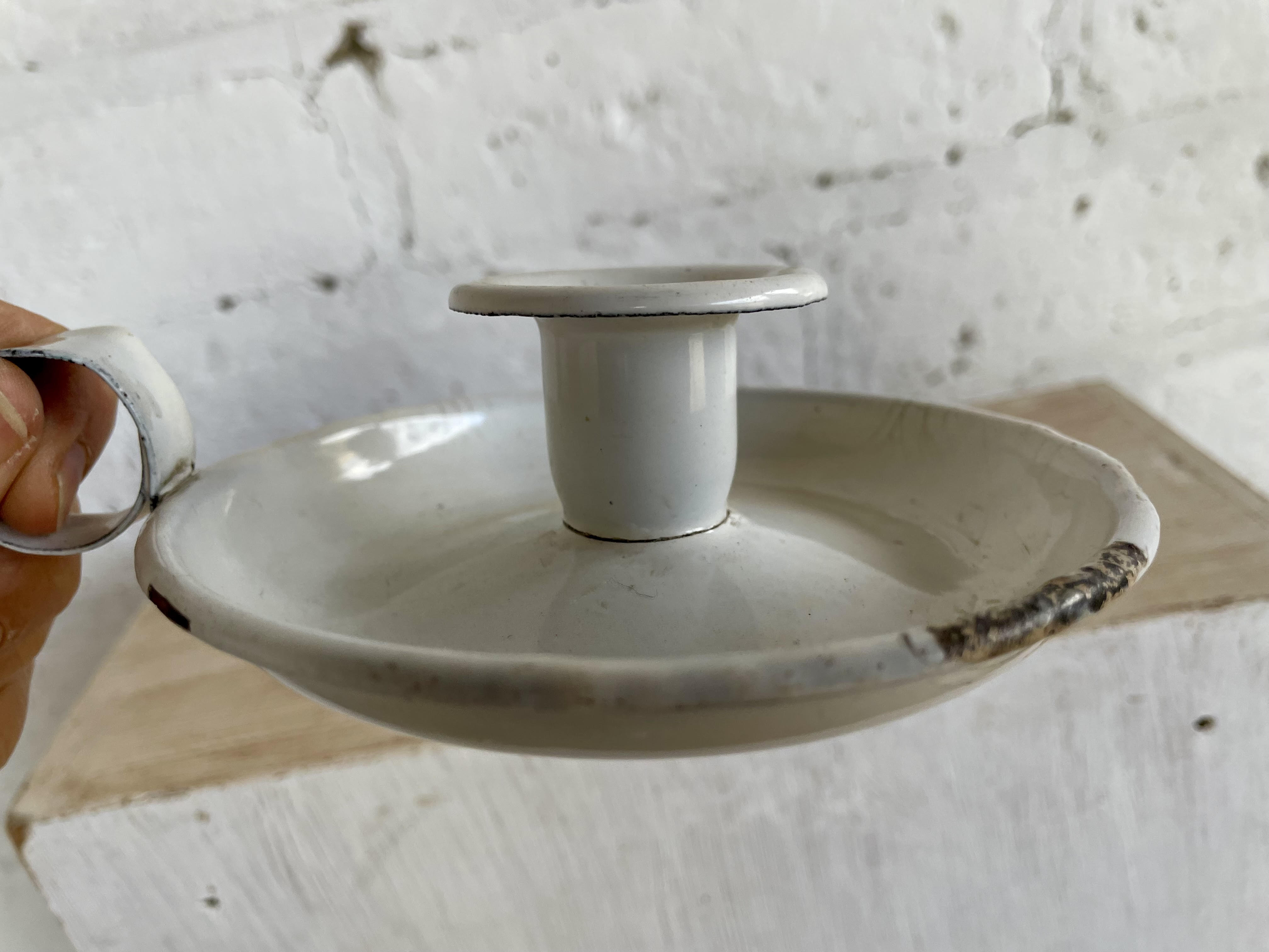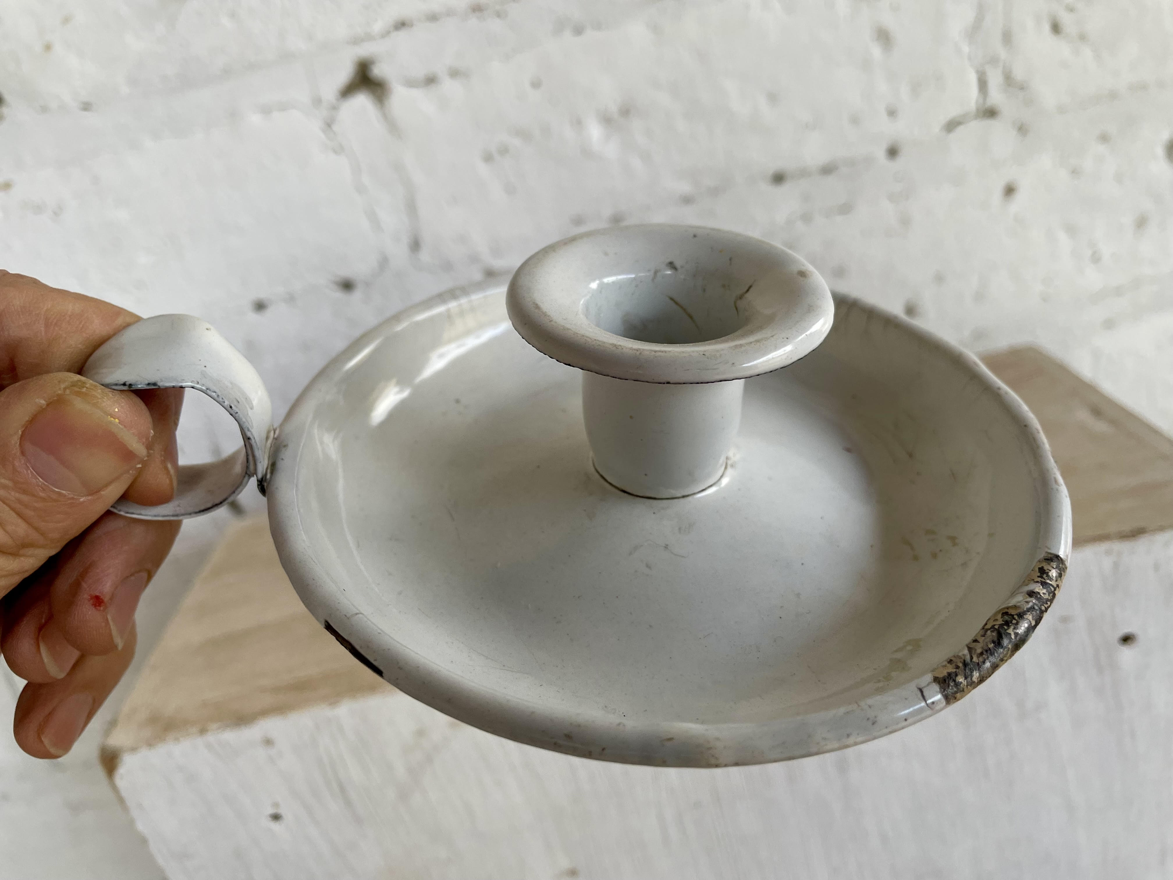 Candelero metálico esmaltado utilizado en los años setenta. Presenta desportilladuras y desgastes en el esmalte.