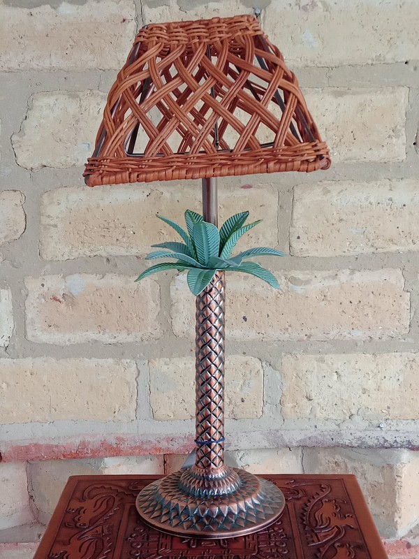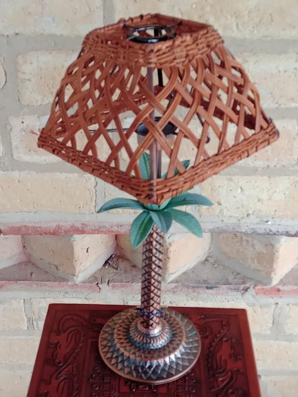Porta veladora estilo "tiki" con base metálica de palmera y cubre vela metálico cubierto en ratán, diseñada en U.S.A. para la colección de verano del 2000 de la tienda Kirkland´s Home y fabricada en China. Se encuentra en buen estado.