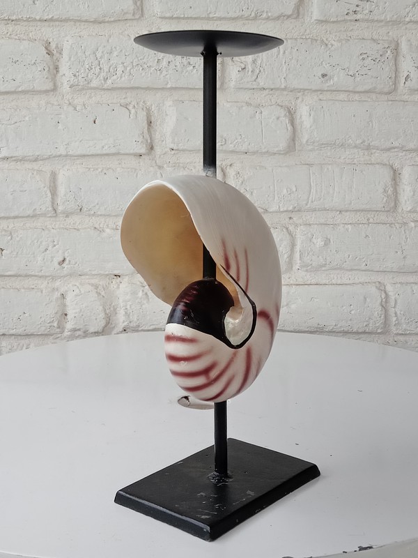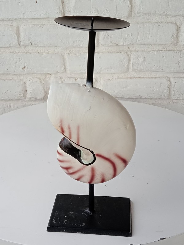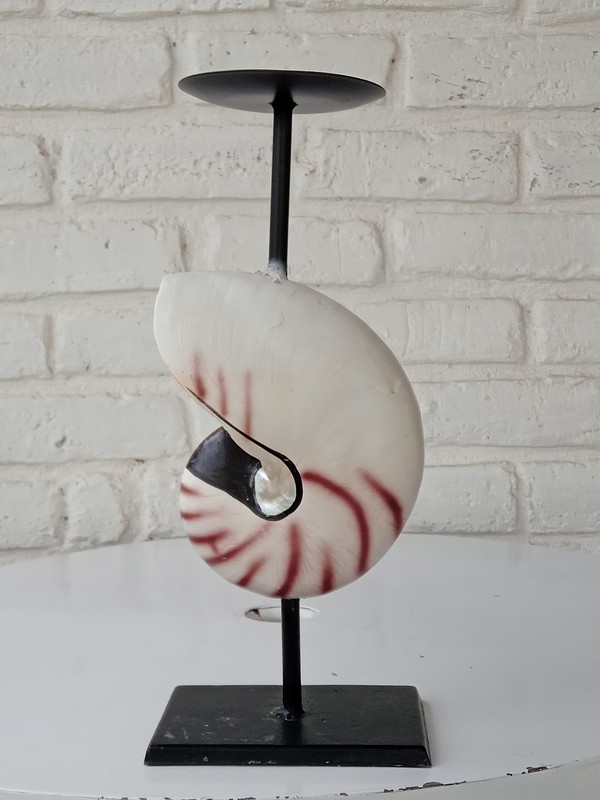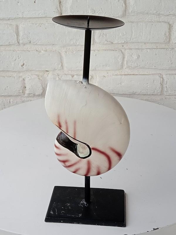 Portavela y base metálicas decoradas con la concha de nautilus elaborada en resina con apariencia natural.