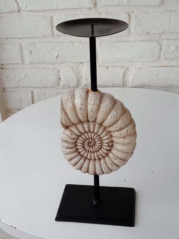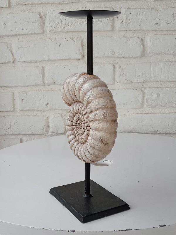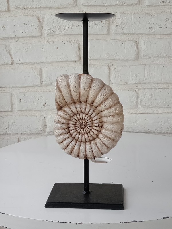 Porta vela con base metálica decoradas con la réplica de un fósil elaborado en resina con apariencia natural.