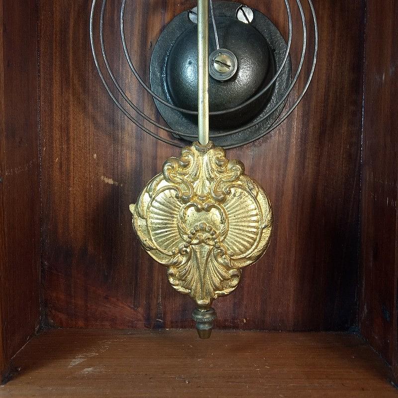 De cuerda, fabricado a finales del S. XIX, modelo patentado en 1881. La caja en madera presenta el desgaste producido a través del tiempo, las campanadas suenan cada hora. El timbre y algunas piezas son en bronce, su maquinaria es original. El paisaje con un pájaro, característico de esta marca, se encuentra tallado en el vidrio de la puerta. Tiene llave para dar cuerda al mecanismo del sonido y al movimiento de las manecillas.