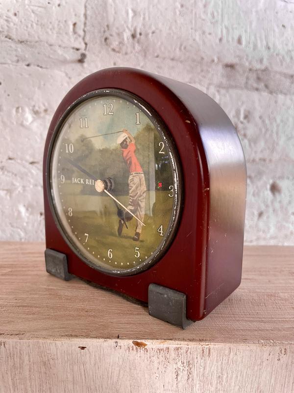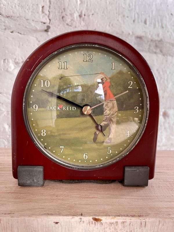 Reloj retro caparazón de madera, marco metálico y vidrio cóncavo, trabaja con una pila AA. La madera tiene rayaduras y desgastes por el uso. El tablero está decorado con una ilustración del golfista escoces Jack Reid. El mecanismo funciona bien.