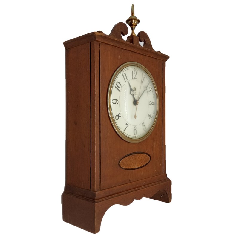 Reloj de repisa síncrono modelo 4H173, fabricado en los años 40´s, tiene el punto rojo en en el tablero, indicativo de interrupciones en el fluido eléctrico. La caja es en madera y el adorno superior en bronce.