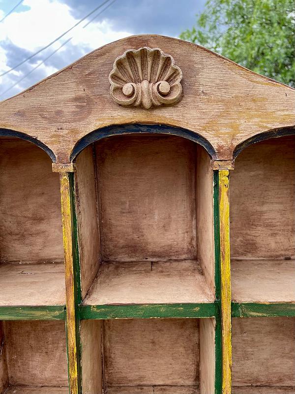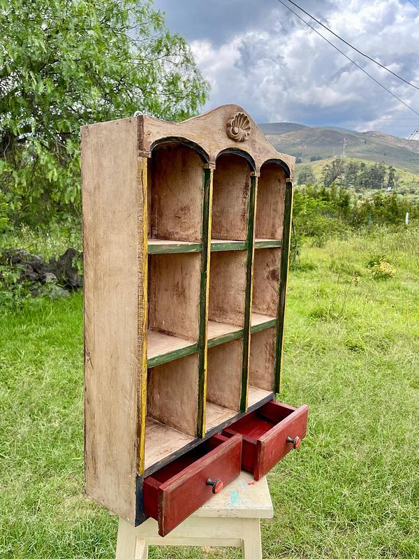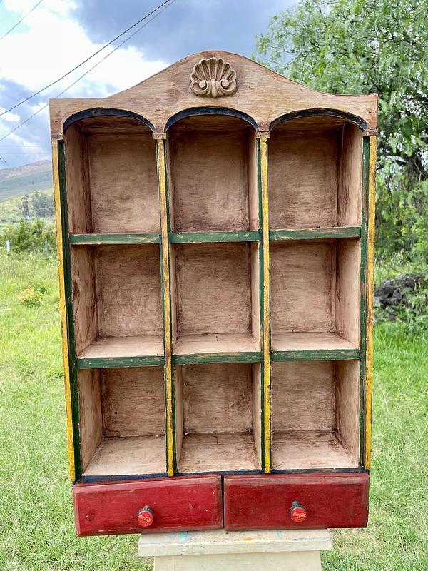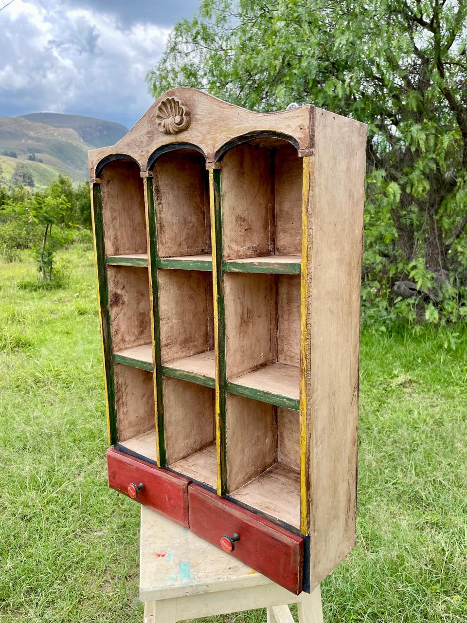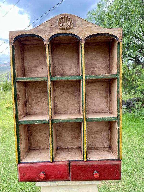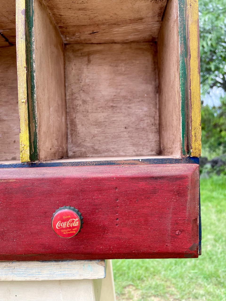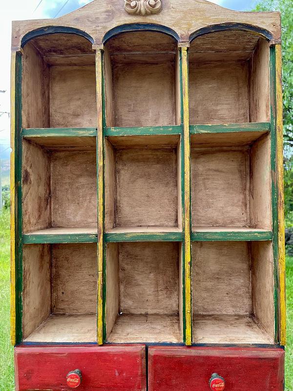 Estante exhibidor de los años setenta rescatado de una tienda antigua en una vereda de Sogamoso Boyacá elaborada artesanalmente con 9 compartimentos y dos cajones con dos perillas fabricadas con tapas de Coca Cola engastadas sobre dos ejes metálicos atornillados a la madera. Los colores originales se encuentran desteñidos y manchados por el paso del tiempo, la madera está bien conservada.