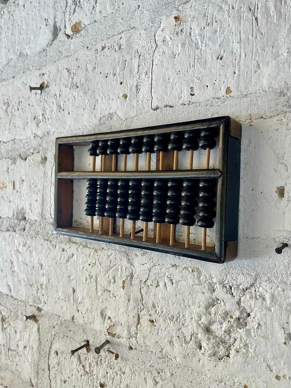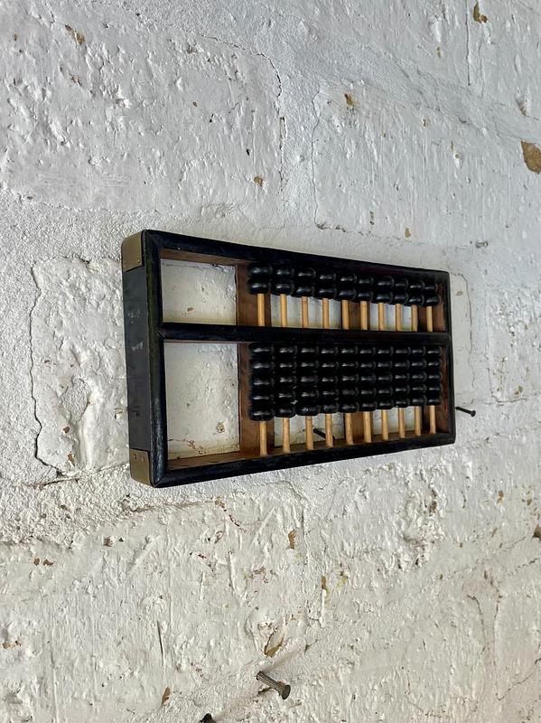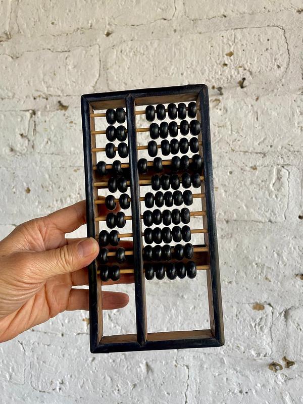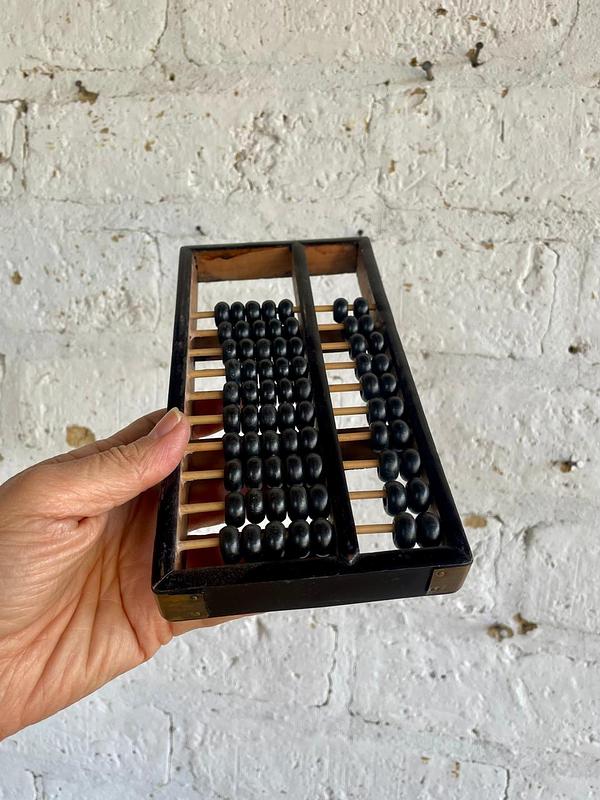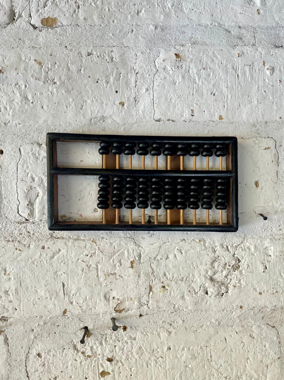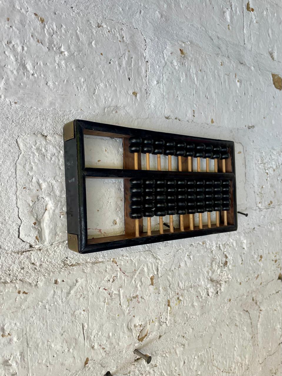 Abaco con marco, 10 varillas y cuentas de madera, los refuerzos en las esquinas son en lámina de bronce. Este ábaco originalmente era de 13 varillas, le faltan 3 varillas. Elaborado en China en los años ochenta.