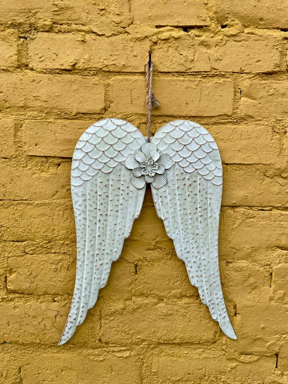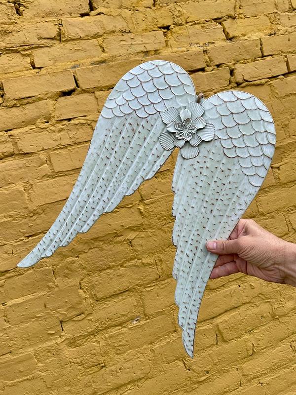 Alas artesanales elaboradas en lámina metálica gruesa repujada, decoradas con pintura blanca desgastada con arapiencia envejecida.