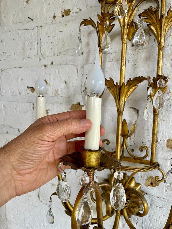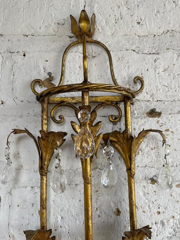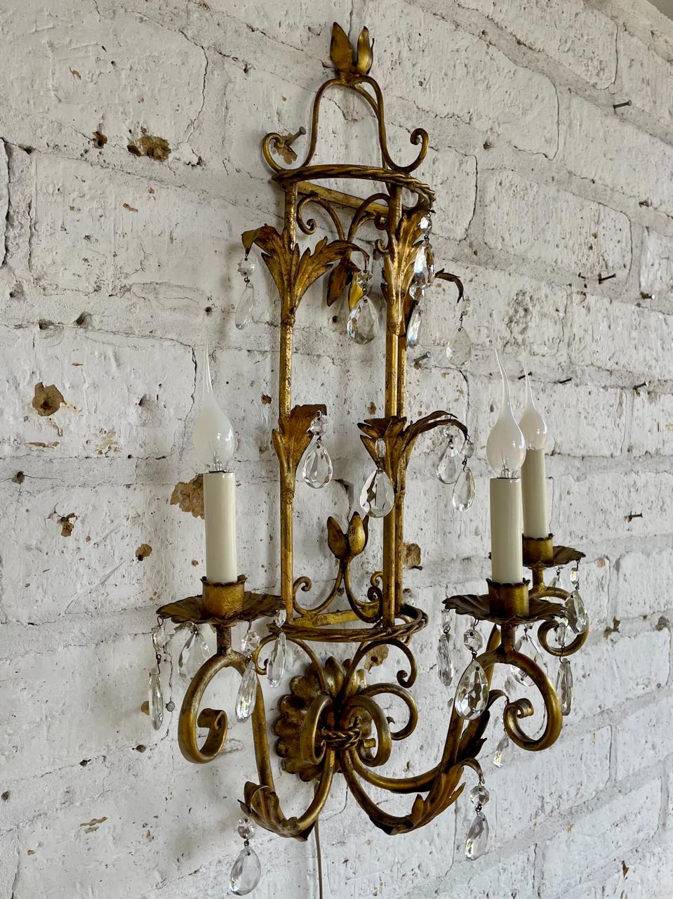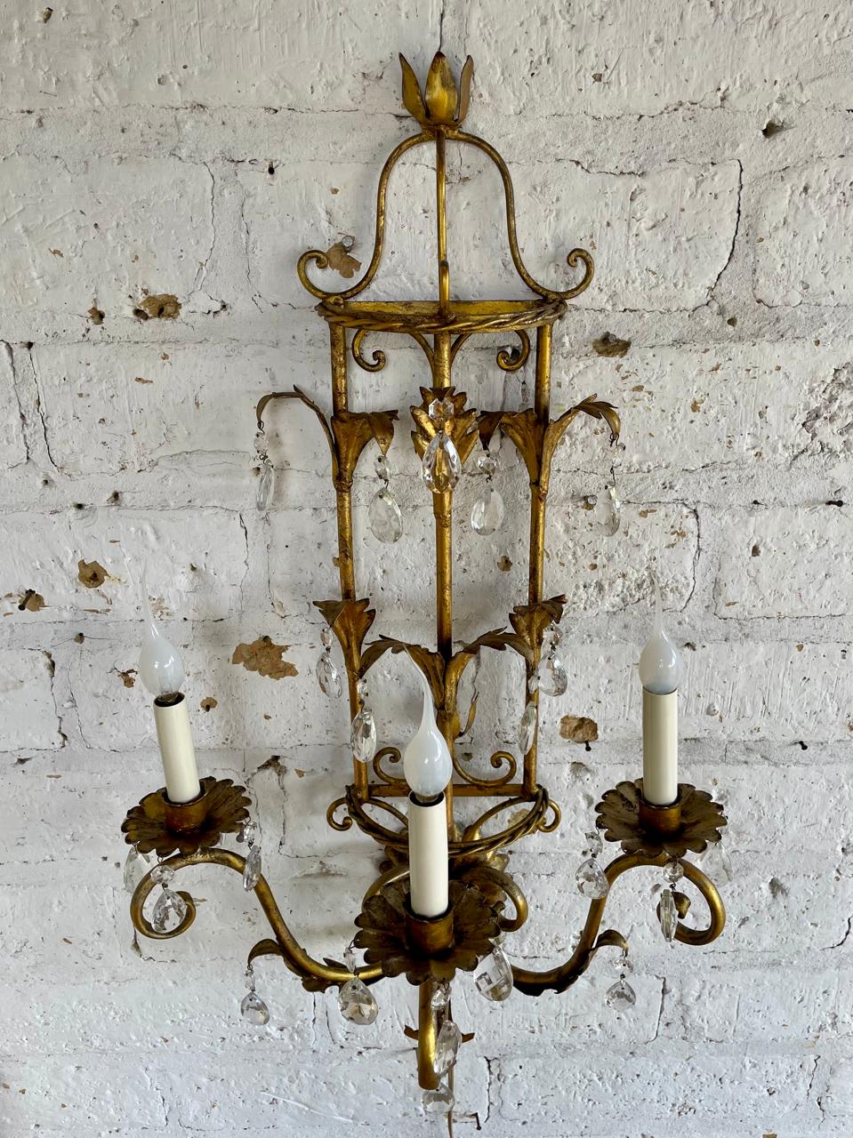 Lámpara florentina metálica de los años setenta, aplique de pared vintage de 3 brazos con porta lámpara tipo candelabro y prismas de cristal. Decorada con hojas de acanto en lámina metálica gruesa cubiertas con pintura dorada desgastada. Se encuentra en buen estado, el sistema eléctrico funciona perfectamente.