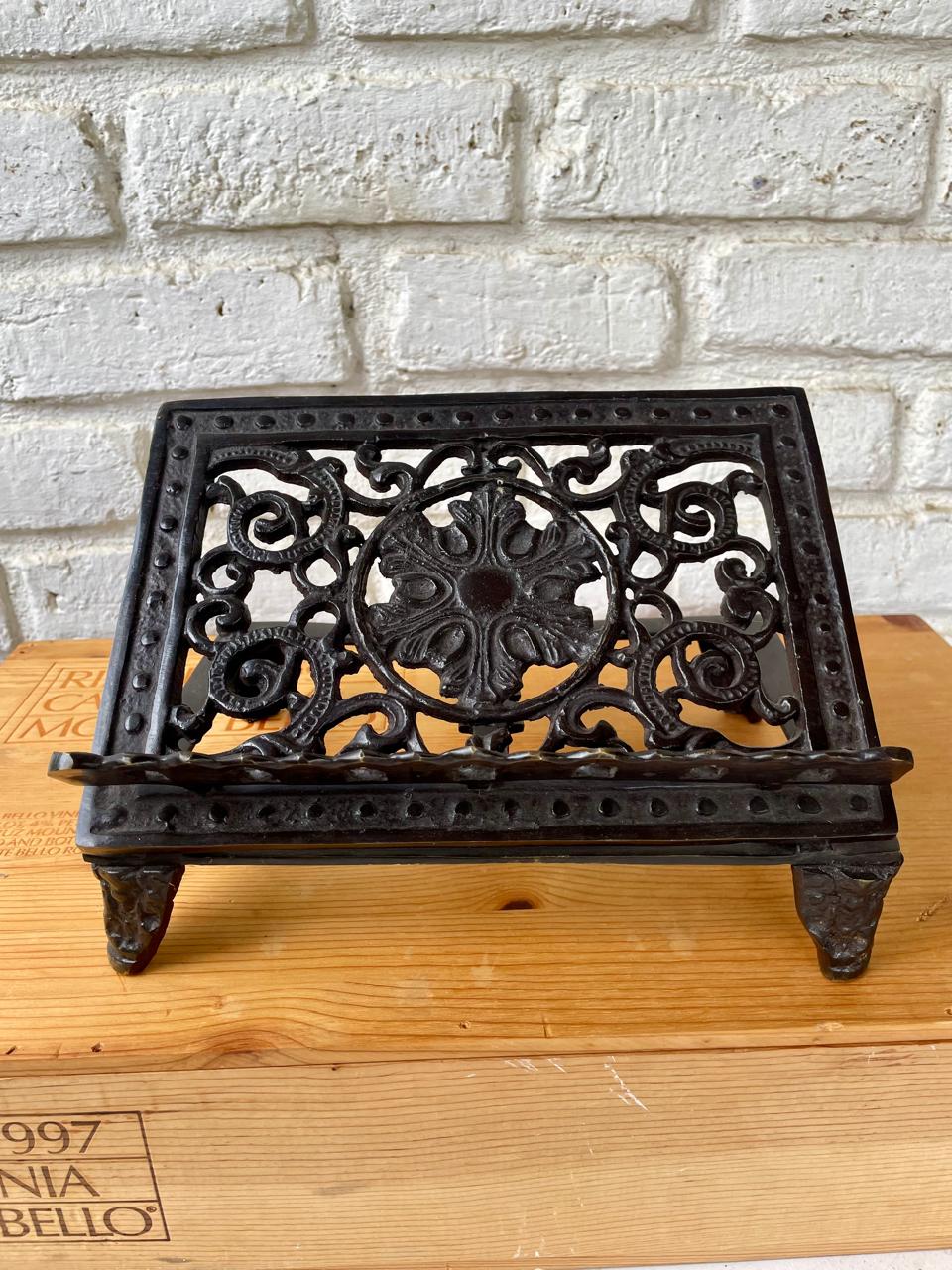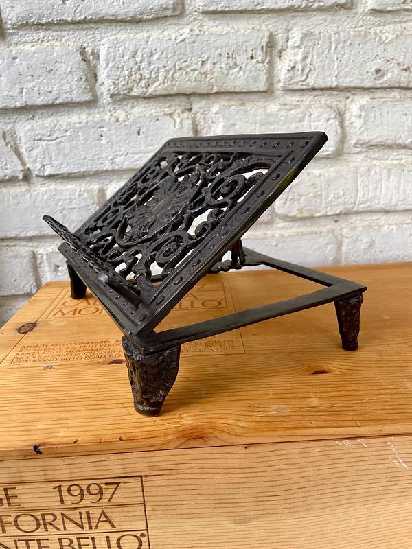 Atril plegable de sobremesa para libros en bronce fundido, la base tiene un soporte que permite graduar el ángulo de inclinación de la bandeja que soporta el libro. Se puede utilizar para sostener libros, partituras o recetas, proporcionando una superficie de lectura cómoda y estable.