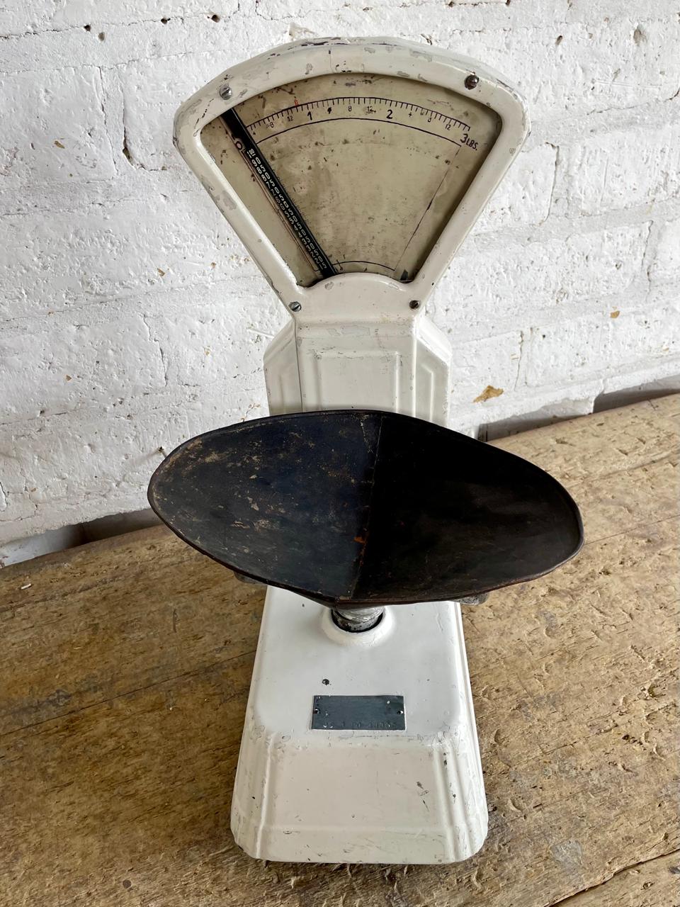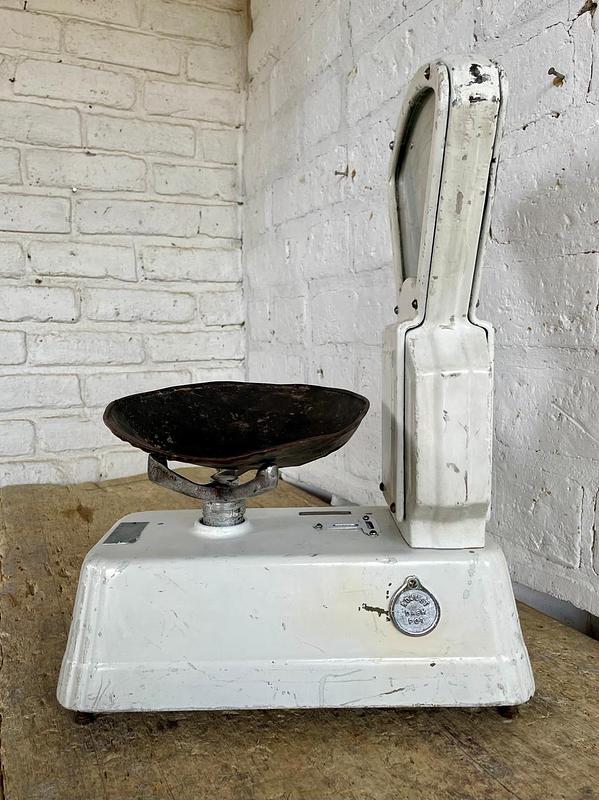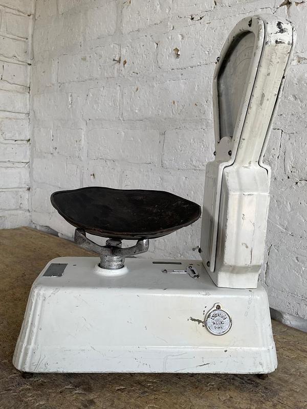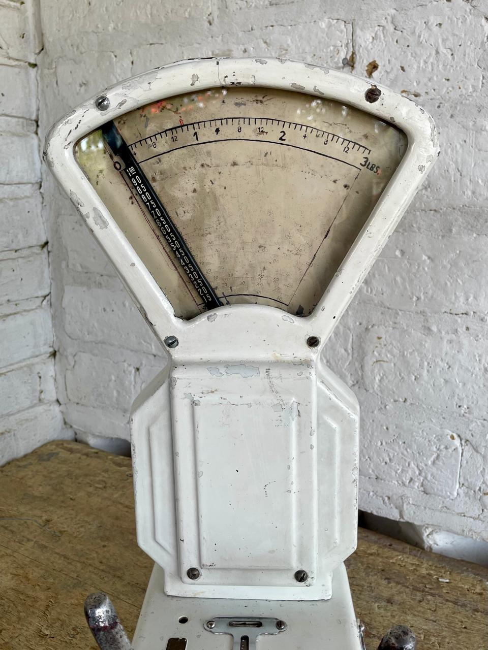 Antigua báscula de tienda de fabricación Estadounidense de la primera mitad del S XX. con capacidad para pesar hasta 3 libras. Tiene un tablero por cada cara con manecillas que marcan el peso. La base es en hierro fundido, el platón de lámina metálica gruesa y la superficie es esmaltada presenta algunas raspaduras. La impresión de las escalas del peso en los tableros metálicos se encuentra borrosa. El sistema de manecillas funcinonan marcando el peso del objeto que se deposite en el platón.