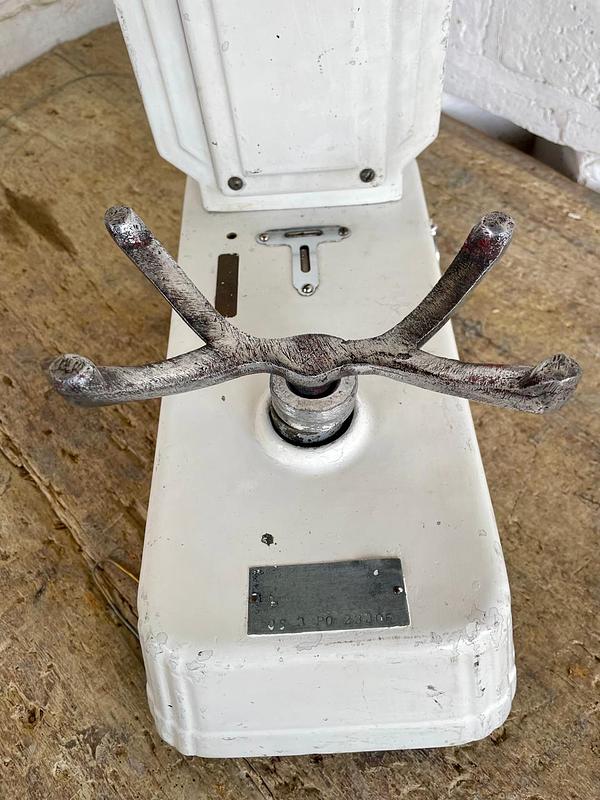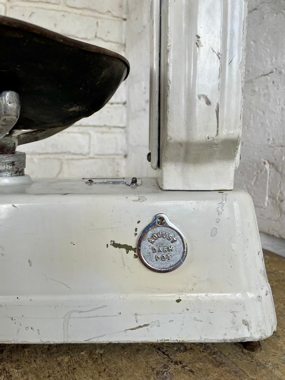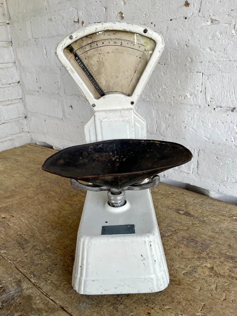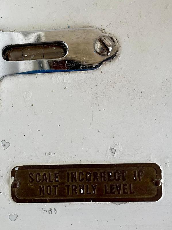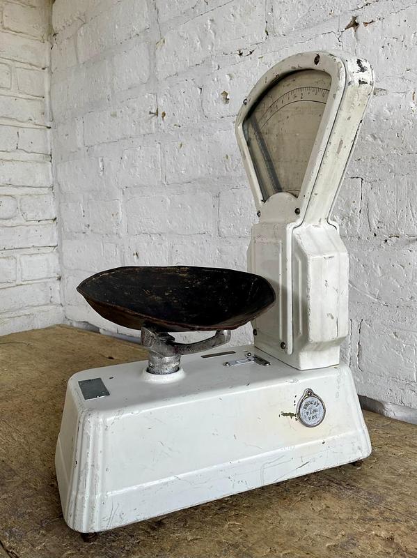 Antigua báscula de tienda de fabricación Estadounidense de la primera mitad del S XX. con capacidad para pesar hasta 3 libras. Tiene un tablero por cada cara con manecillas que marcan el peso. La base es en hierro fundido, el platón de lámina metálica gruesa y la superficie es esmaltada presenta algunas raspaduras. La impresión de las escalas del peso en los tableros metálicos se encuentra borrosa. El sistema de manecillas funcinonan marcando el peso del objeto que se deposite en el platón.