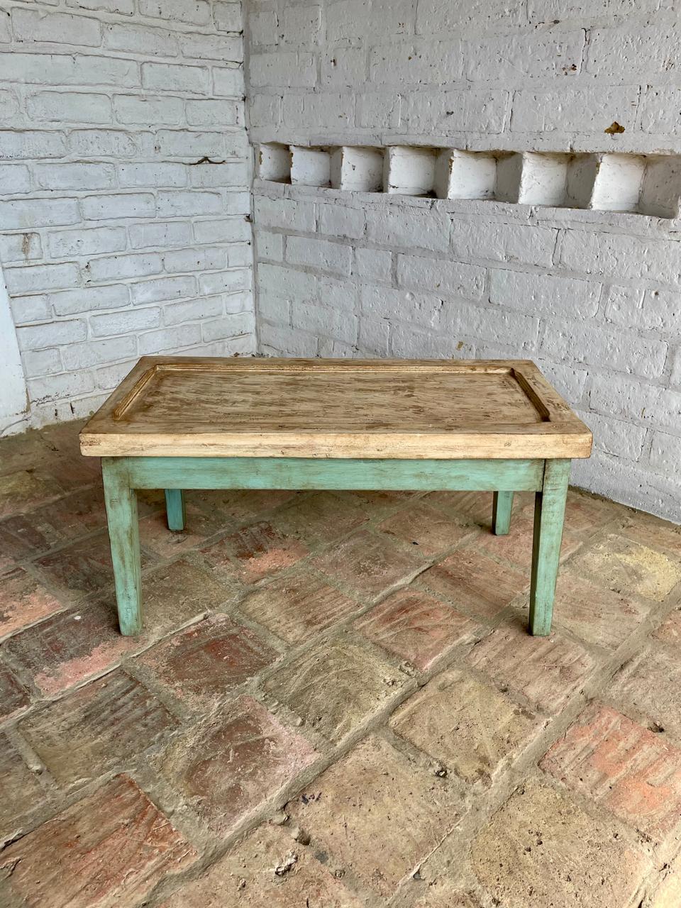 Una ventana en madera maciza de una casa antigua se utilizó para asiento de esta banca, las patas tambén se fabricaron con madera antigua recuperada. Se puede utilizar como banca o como mesa.