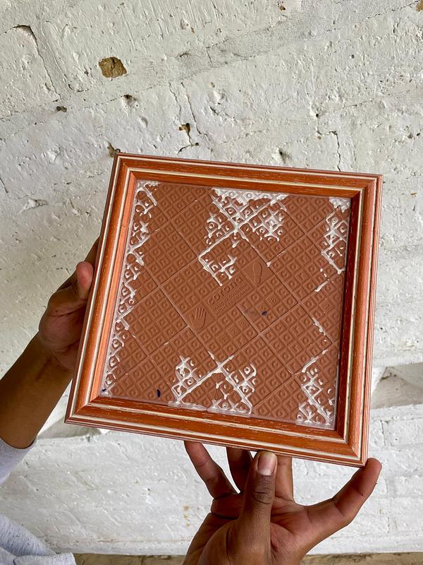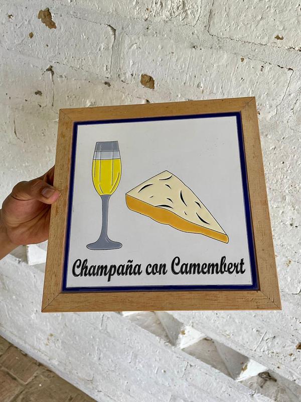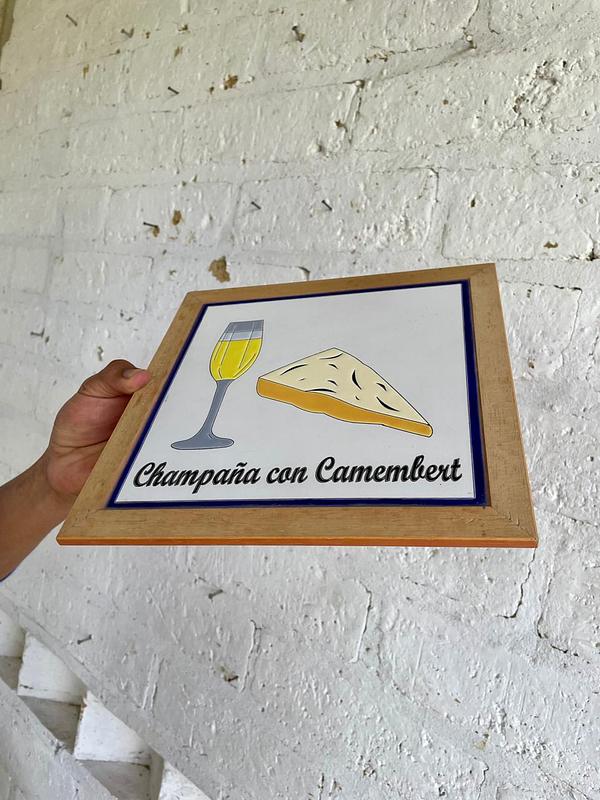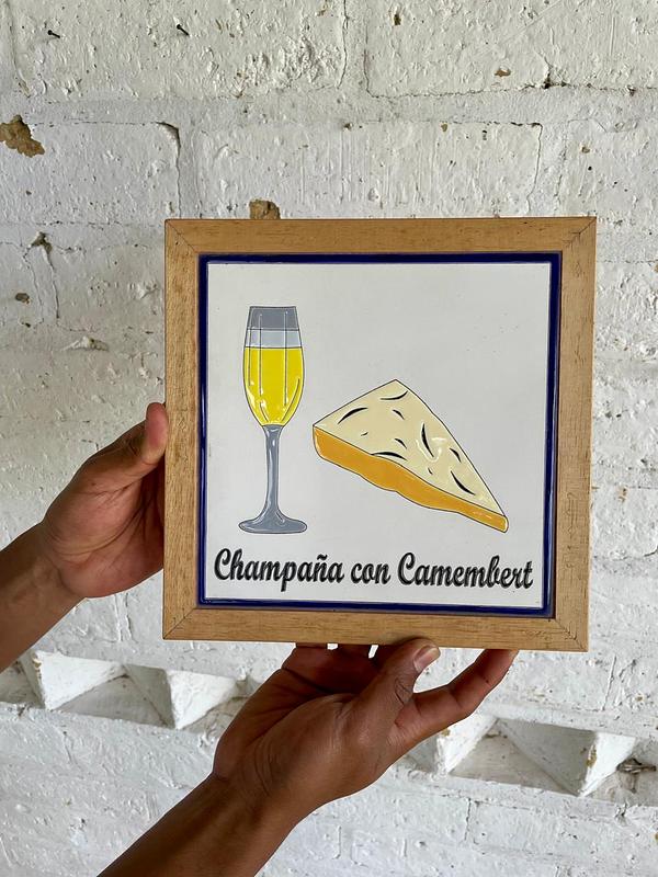 Tabla para quesos con marco de madera y superficie de baldosa pintada artesanalmente.