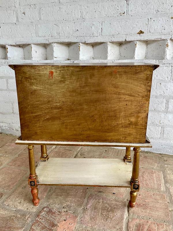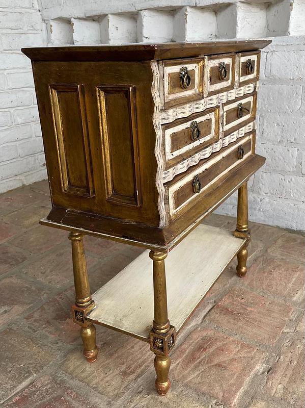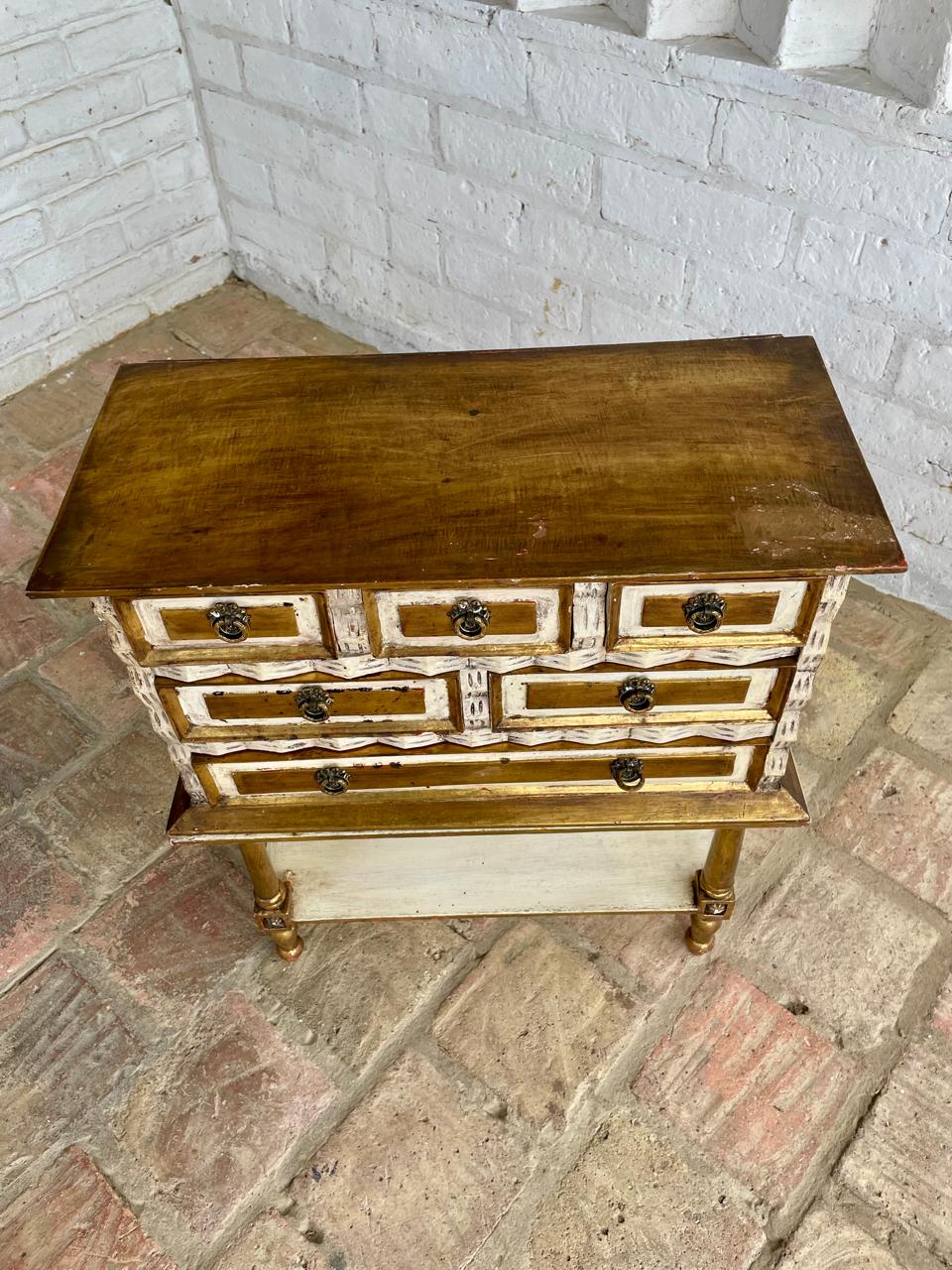 Cajonero de madera elaborado artesanalmete en Italia, la madera tallada está decorada en dorado y blanco, los cajones tienen jaladores de bronce. El cajonero se puede separar de la mesa base. La madera se encuentra en buen estado, el color dorado presenta algunas rayaduras y desgastes.