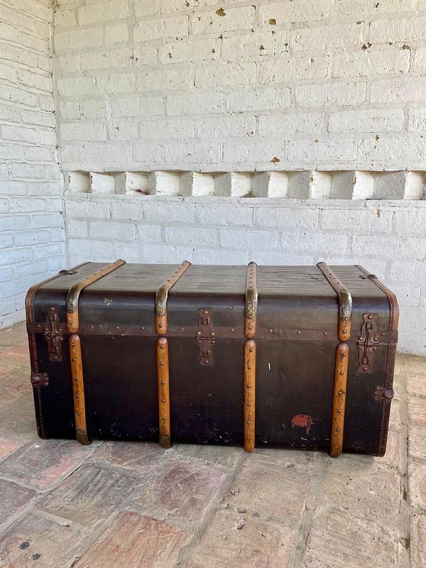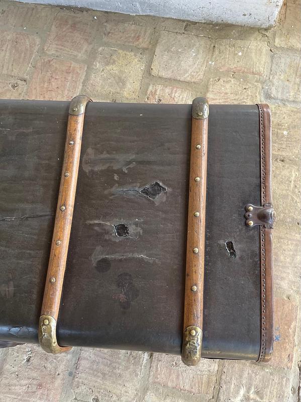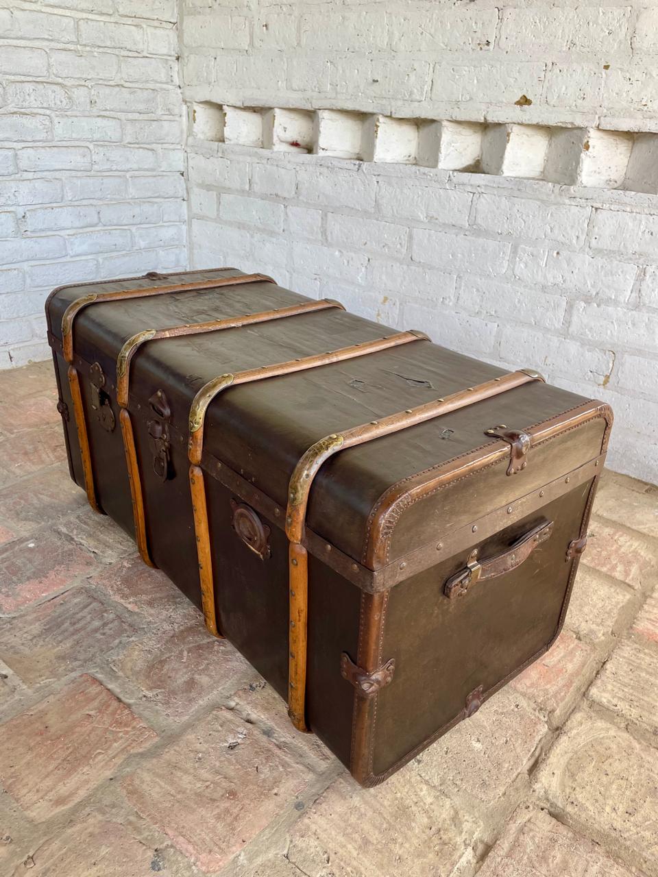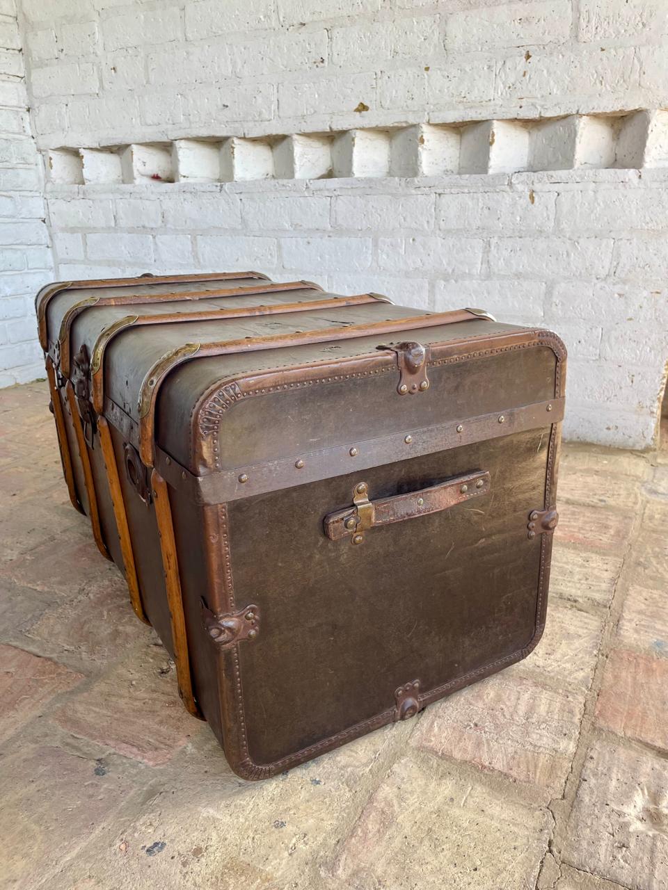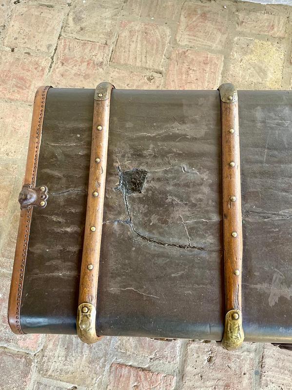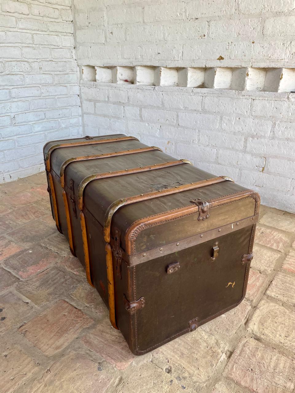 El baúl presenta manchas, rayones y peladuras en el recubrimiento del cuero, le falta la manija de cuero del lado izquierdo, no tiene la chapa derecha, el recubrimiento interno es original y presenta desgastes, manchas y rayaduras. La madera se encuentra en buen estado libre de termitas y comején. No tiene llave.