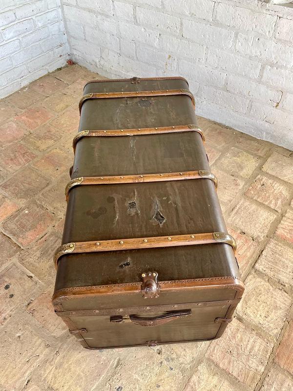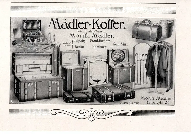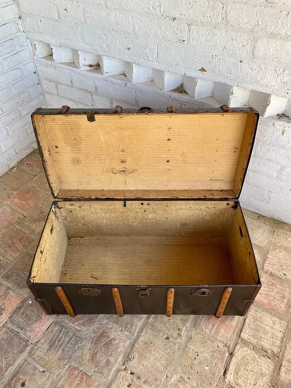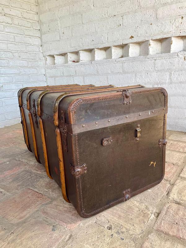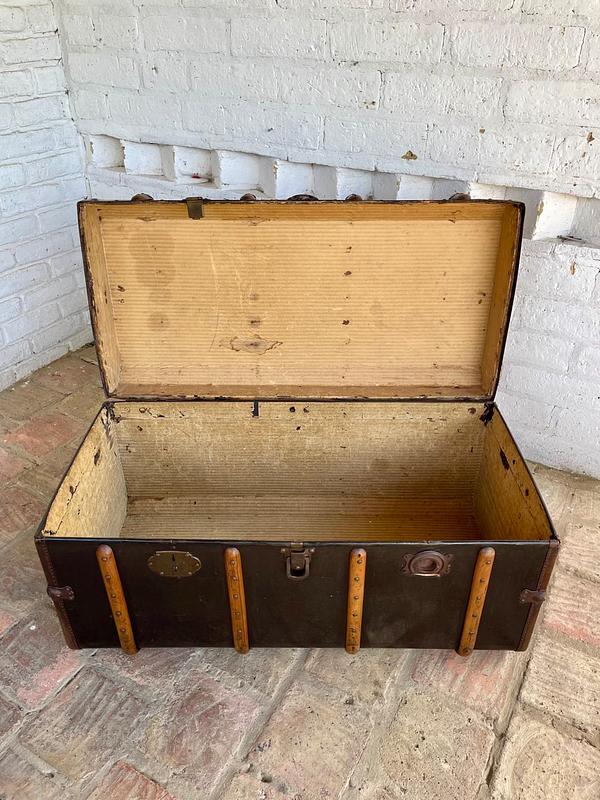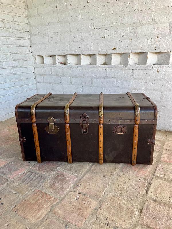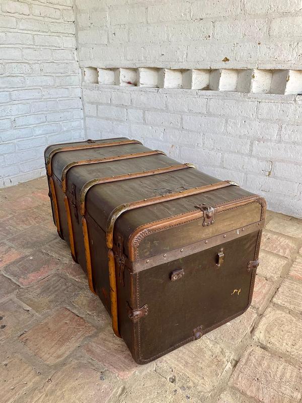 Baúl de principio del S XX fabricado por Moritz Mädler, empresa fundada en Leipzig Alemania en 1850 funcionando hasta medidados del S XX, dedicada a la producción de maletas y baúles para viajes en barco, elaborados con herrajes y taches metálicos, asas de cuero y correas de madera de haya.