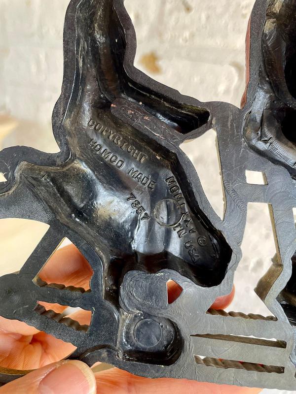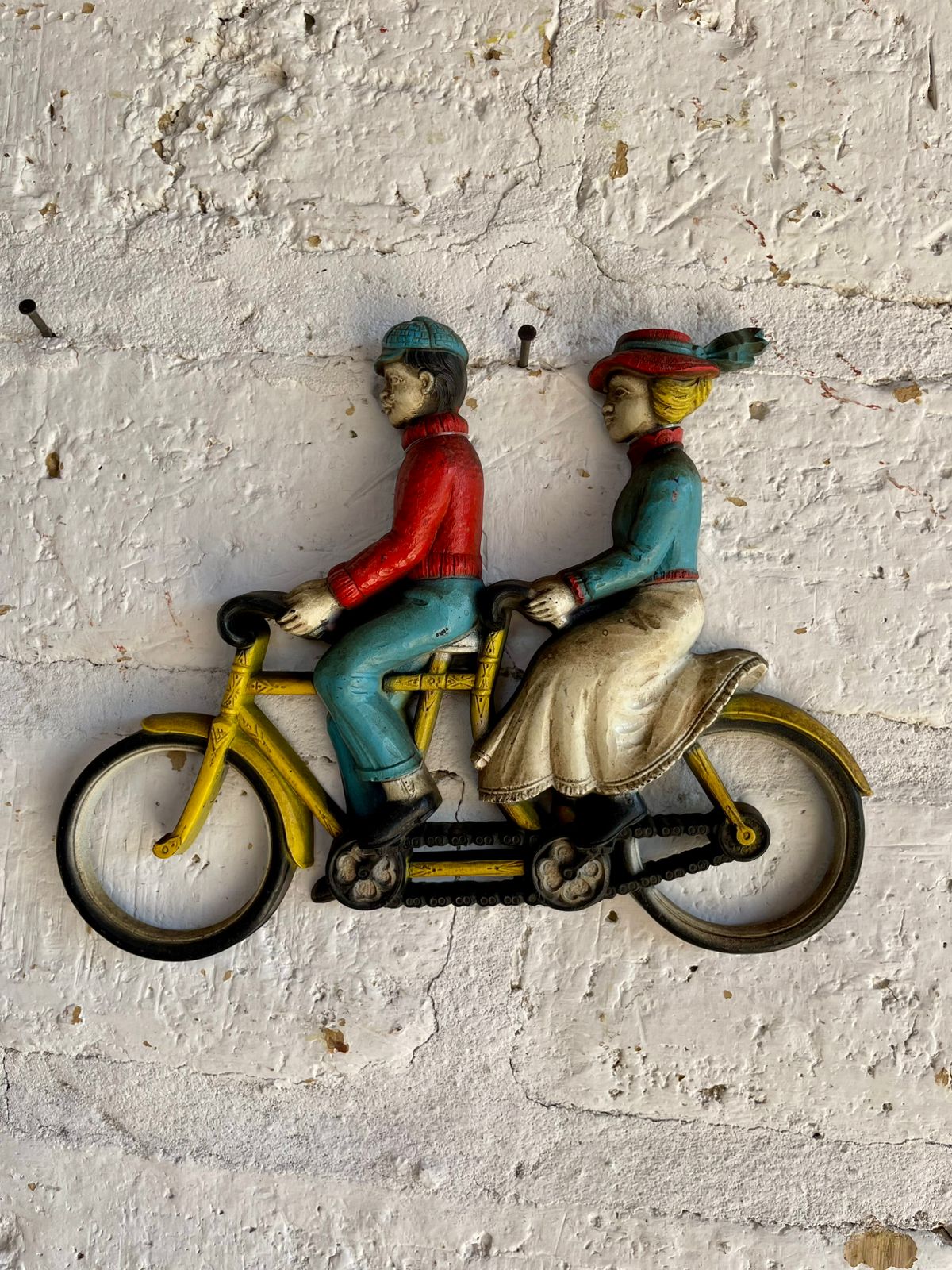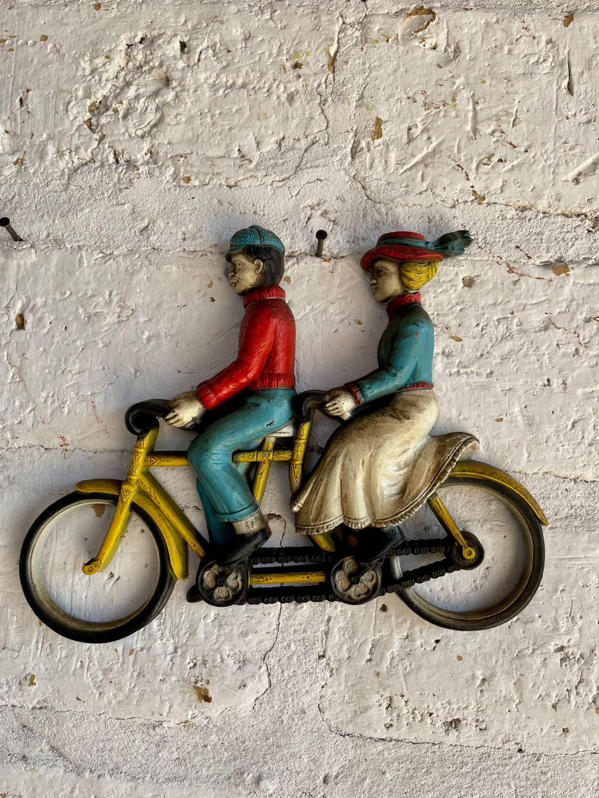 Adorno de pared en resina fuerte de una bicicleta tándem producido en Estados Unidos en los años setenta por la marca Homco, se encuentra en buen estado.