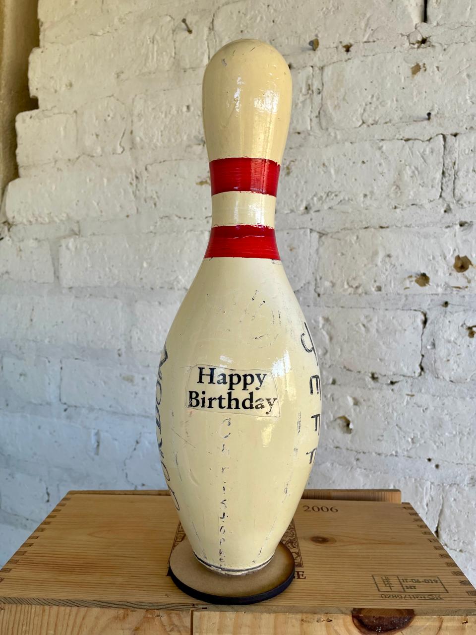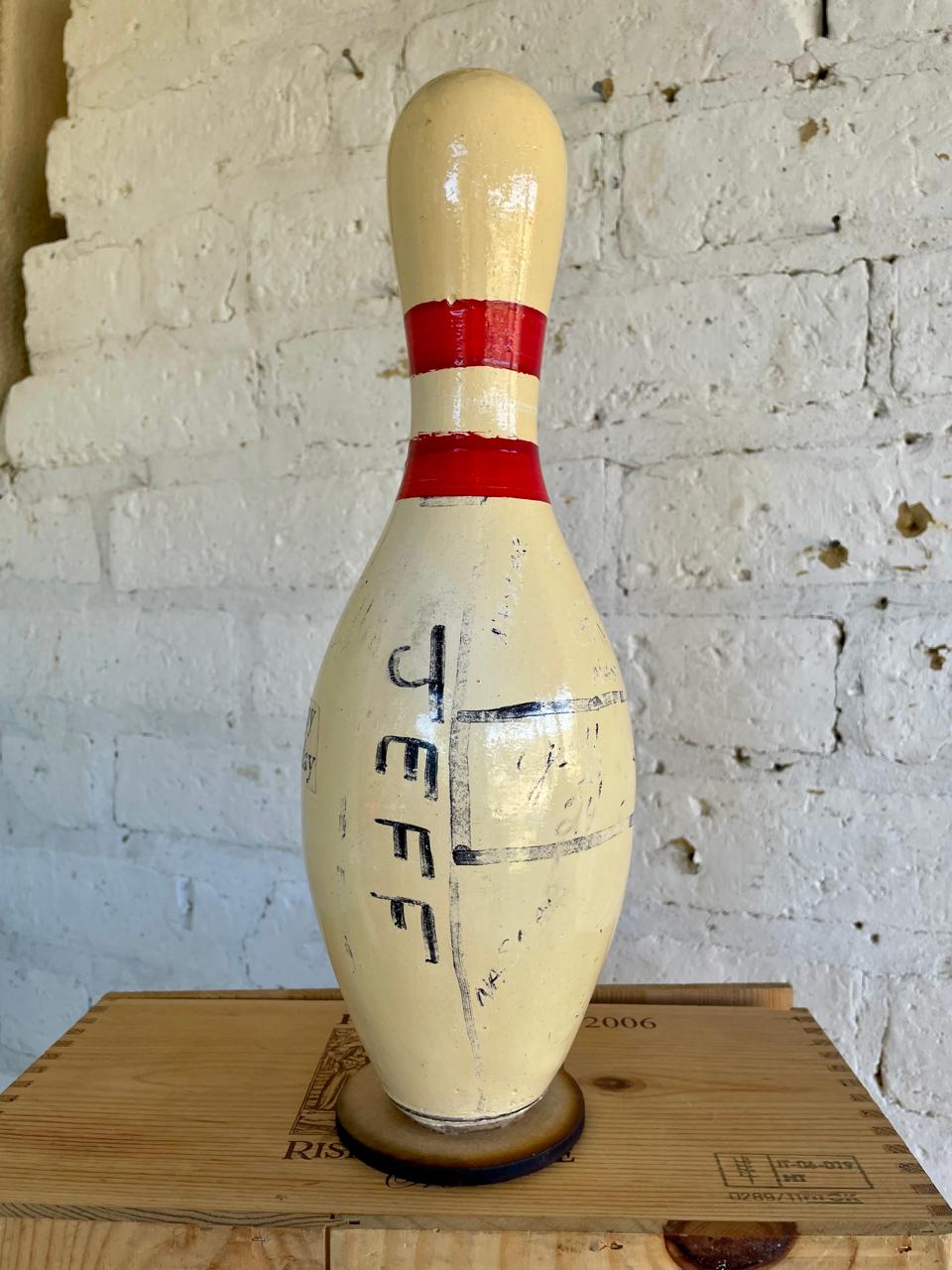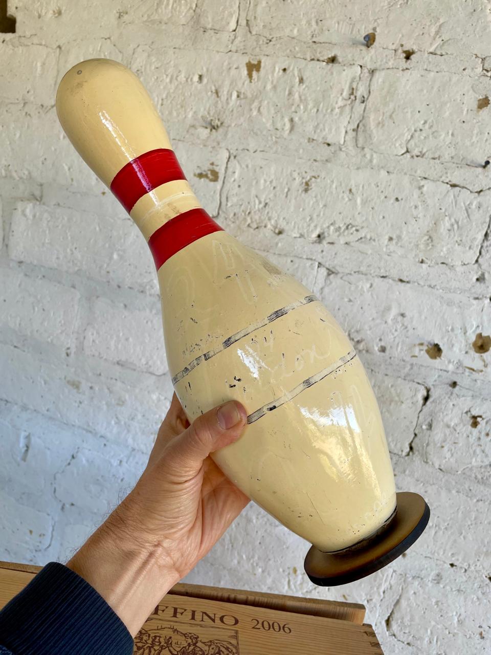 Botella vintage de juego de bolos en madera maciza, tiene peladuras y algunas manchas pintadas con marcador. En la base se le agregó un circulo de madera para darle estabilidad.