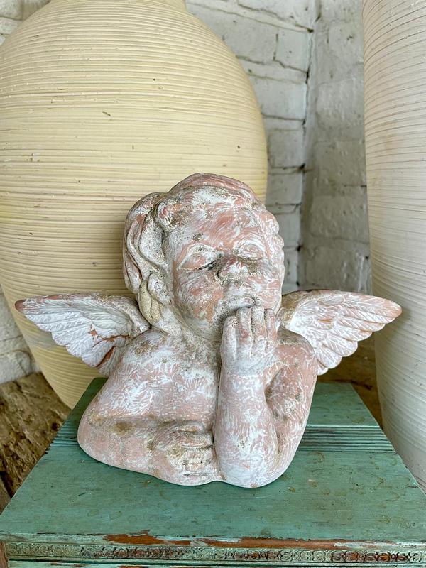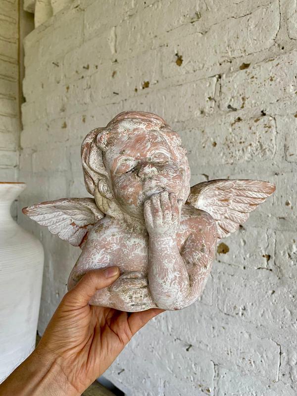 Figura réplica en terracota de uno de los querubines que aparecen en la parte inferior del cuadro "La Madonna Sixtina" del artista renacentista Rafael. Decorado con pintura desgastada con apariencia envejecida. Se encuentra en buen estado.