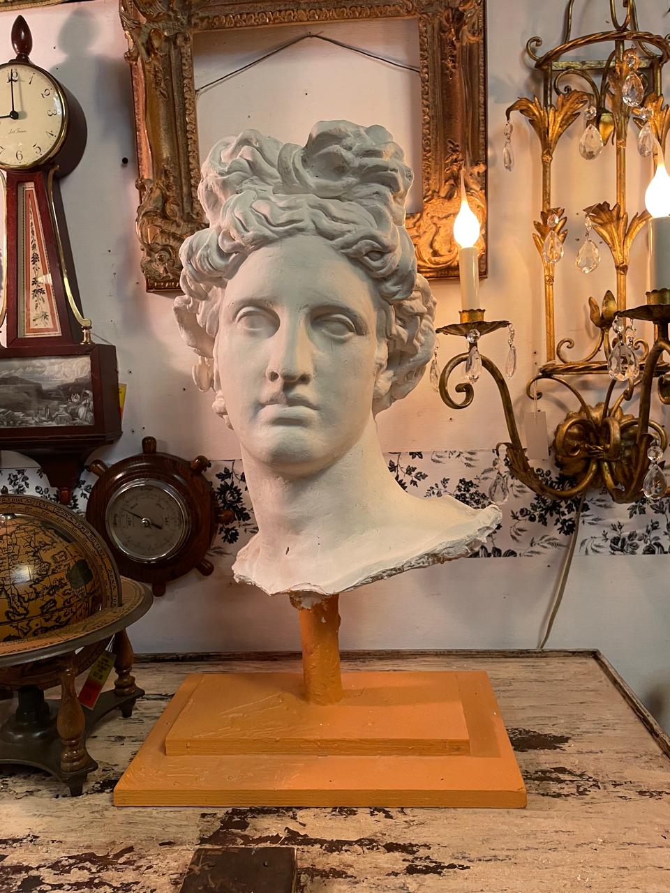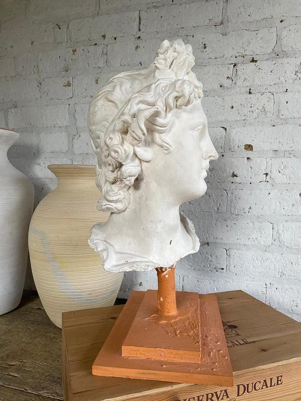 Réplica en yeso de la cabeza del Dios griego Apolo, el original de mármol se encuentra en el Vaticano. Elaborada recientemente por artistas locales de manera artesanal. La base es de madera.