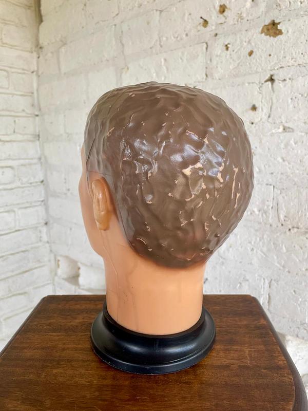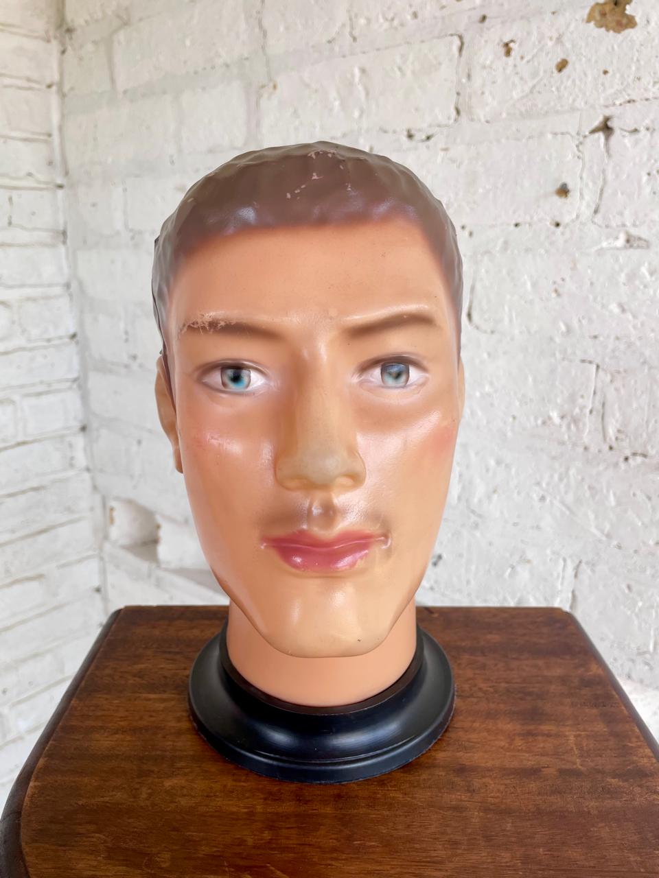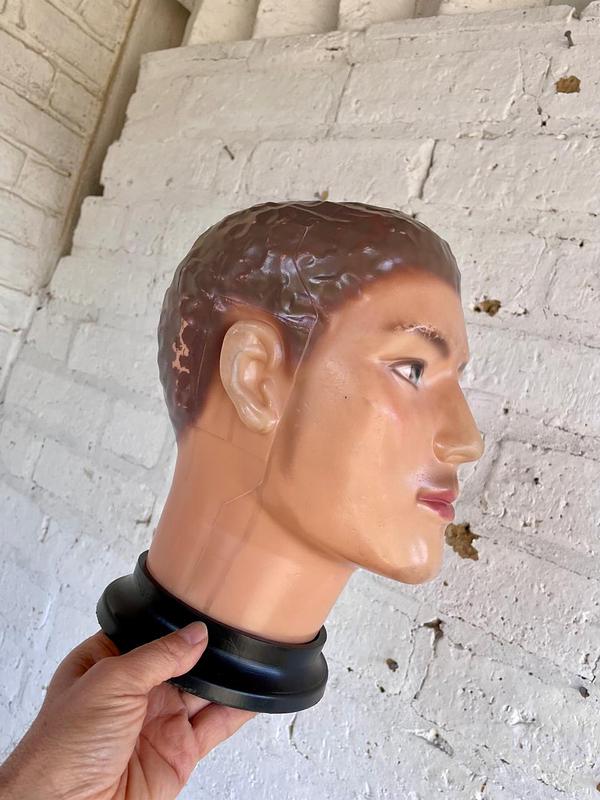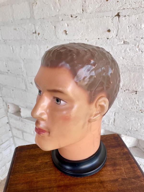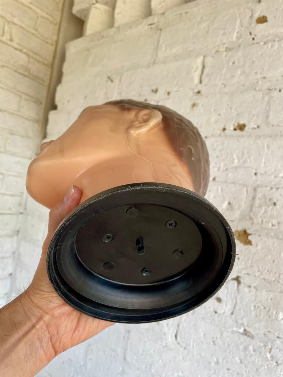 Cabeza de maniquí fabricada en los años ochenta elaborada en plástico. Se encuentra en buen estado.