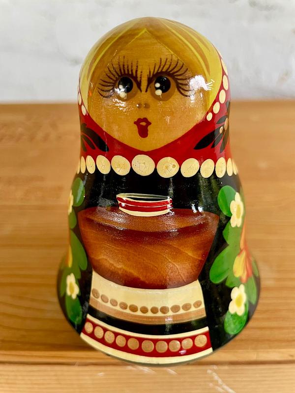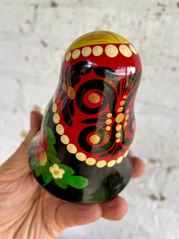 Muñeca rusa Roly Poly elaborada en madera y decorada a mano al estilo de las matrioskas. Su base semiesférica y un peso interno la hacen regresar a su posición vertical después de ser empujada mientras suena una campanilla escondida en su interior. Se encuentra en buen estado.