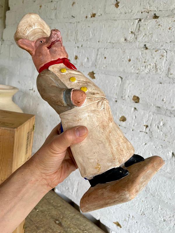 Figura francesa de cociero de mediados de los años noventa, representa a un cerdo chef con soporte en el gorro para una vela a manera de candelabro, capturando el espíritu lúdico de las tiendas de alimentación y cafeterías tradicionales francesas. La cerámica se ha modelado artesanalmente y se ha pintado a mano resaltando los rasgos humanos en la figura del cerdo . La superficie presenta un suave desgaste propio de la edad, que realza su auténtico carácter vintage sin restarle fuerza visual. Diseñada como pieza de exposición decorativa, esta figura escultórica constituye un llamativo punto focal en un escaparate, comedor, cocina o interior comercial. El cocinero está en excelentes condiciones acordes con la edad y el uso y sigue siendo robusto y visualmente impactante. La base tiene el sello "Fleur de Lis"